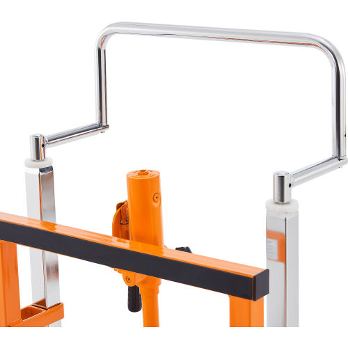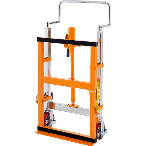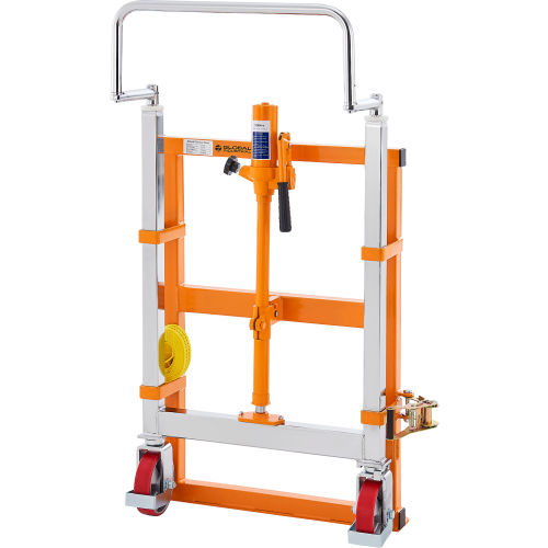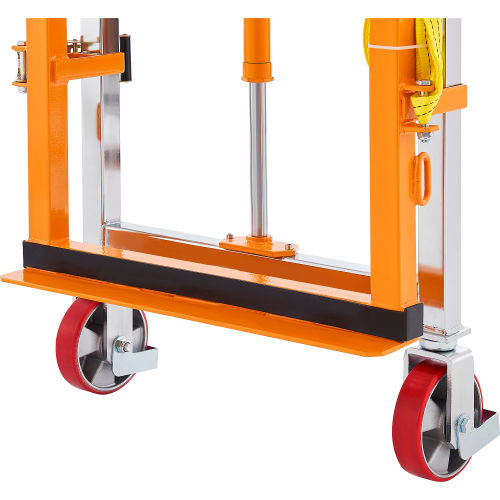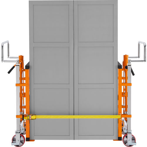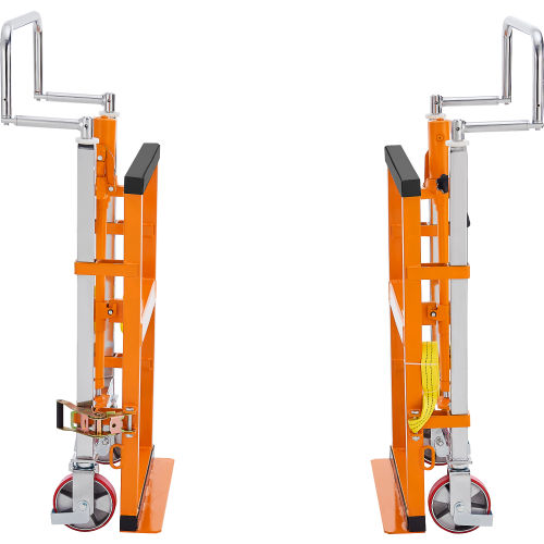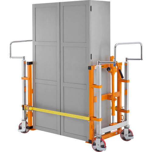 Hand Operated Hydraulic Furniture & Equipment Moving Dolly (Pair) 3950 Lb. Capacity Our machinery moving dolly safely transports furniture, computer equipment or any odd-shaped item easily. This simple hand-operated hydraulic equipment dolly raises and lowers loads at controlled speeds. The 23"W x 2-1/4"D lift plate raises loads to 10"H. Positive ratchet mechanism with 16" nylon strap secures loads. Wheel dolly rolls smoothly on 6" polyurethane casters. 26-1/2"L x 16"W x 42"H overall and weigh 95 lbs. each. Sold in pairs.