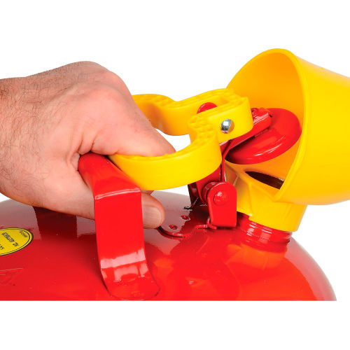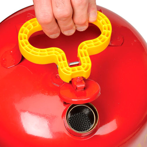 This Type I Safety Can holds gallons and is manufactured with hot-dipped 24-gauge galvanized steel. Deep drawn seamless construction with no top or side seam. Double interlock no-weld bottom seam. Trilingual label. Red baked on powder coat finish. Non-sparking flame arrestor and pour spout. Patented comfort grip trigger release. Fixed handle, included HDPE funnel fits unleaded fuel tanks. Meets OSHA & NFPA Code 30 requirements, FM, UL, ULC Approved.