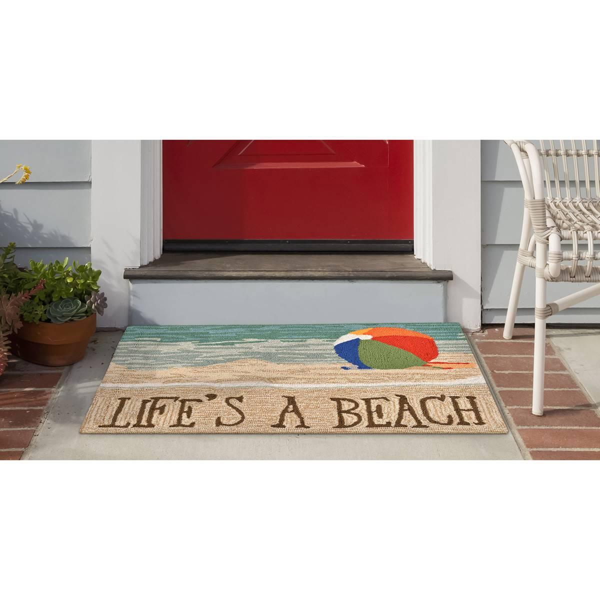This Liora Manne frontporch "Life's A Beach" indoor/outdoor accent rug with richly blended colors and playful novelty design will delight beach lovers everywhere. Hand-hooked of weather-resistant fiber, this rug is a blend of comfort, softness, and durability. Limited Manufacturer's Warranty Vacuum regularlyDo not use beater brushSponge spots clean.
