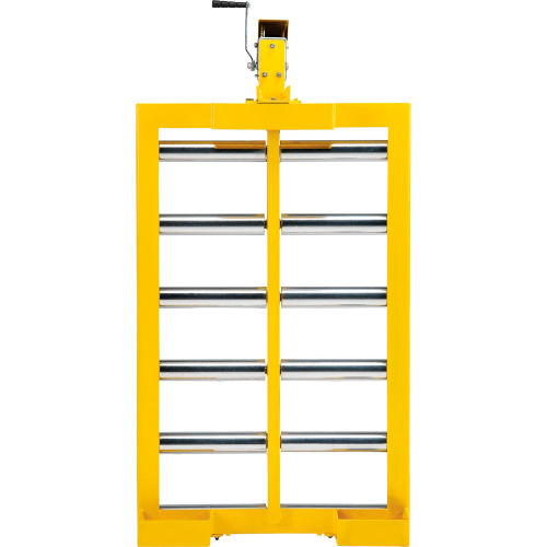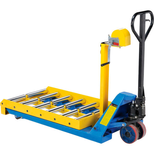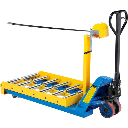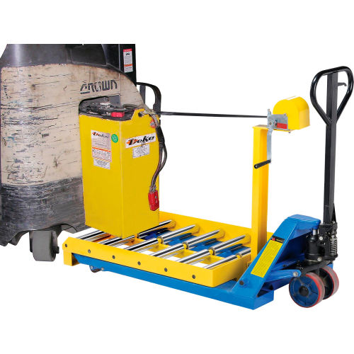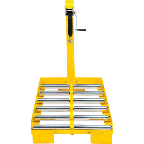 Forklift Battery Transfer Platform 4000 Lb. Capacity - Best Value Convert your existing 27"W x 48"L pallet truck into a cost-effective portable battery changer. One person can load, unload and move forklift batteries. 2-1/4" diameter steel rollers and hand-crank winch with 6' pull strap and safety latch hook safely facilitate horizontal battery transfer. Because the pallet truck's height is adjustable, it aligns easily with forklift's battery compartment; height to top of rollers is 2-5/8" above your pallet truck's forks. Front locking safety tabs secure battery to deck. All-welded steel construction with durable powder coat finish. 48"L x 33"W x 7"H overall (46"H to top of winch) with 40"L x 30"W usable deck. Note: Pallet Truck is not included. Note: Platform Capacity = 4000 Lbs.; Winch Capacity = 1000 Lbs.