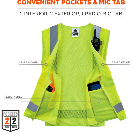 The GloWear 8249Z-S Hi-Vis Surveyors Vest is an ANSI 107 Type R, Class 2 vest with a 3.6oz polyester solid front and breathable 3.3oz polyester mesh back. This hi-vis vest features 2 reflective tape for enhanced low-light visibility. With two interior and two exterior pockets, including a cell phone chest pocket, this vest provides ample storage for pens, notebooks, tablets and more. A single mic tab allows convenient radio access, and a zipper closure makes for easy on and off. SINGLE SIZING This vest is available in single sizes to allow workers to order their exact size for a more tailored, performance-style fit compared to dual-size vests (*tip: for best fit, select one size down from your normal T-shirt size). The 8249Z Hi-Vis Surveyors Vest is our identical dual-size model for those who prefer a looser fit for wear over sweatshirts or jackets. This reflective safety vest is ideal for anyone requiring Type R, Class 2 apparel. Features: HIGH VISIBILITY ANSI/ISEA 107, Type R Class 2 compliant with 2" reflective tape for low-light visibilitySOLID FRONT & MESH BACK Lightweight 3.6oz polyester solid front with breathable 3.3oz polyester mesh backEASY ON & OFF Zipper closurePOCKETS 2 interior, 2 exterior for storage of cell phones, tablets, pens and moreMIC TAB For convenient radio accessSINGLE SIZING Allows workers to order their exact size for optimal fit (*tip: select one size down from your normal T-shirt size)MACHINE WASHABLE.