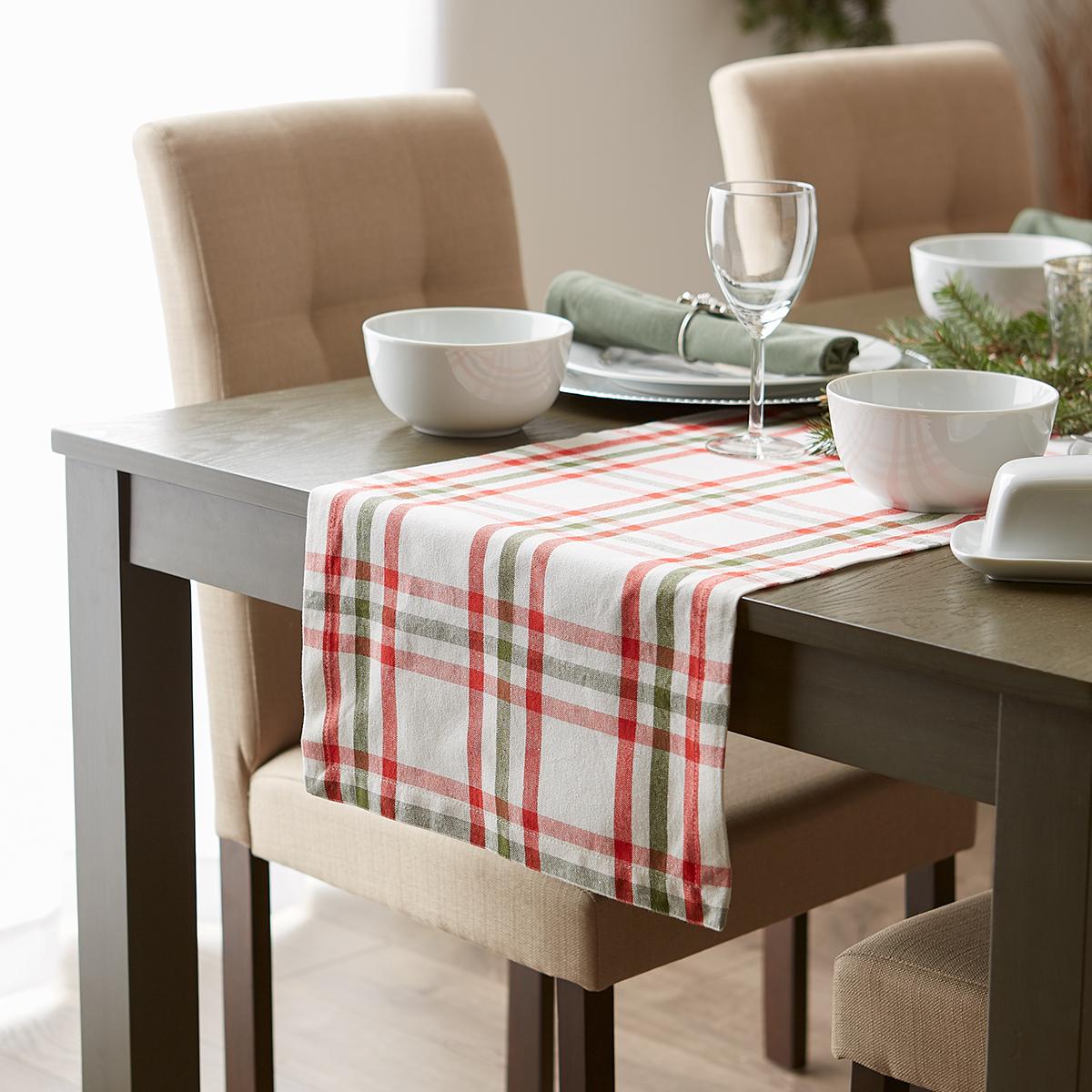 The DII(R) Nutcracker Plaid Table features a traditional Christmas holiday plaid design. Constructed with 1" hem with mitered corners. This table runner is perfect for your holiday table.