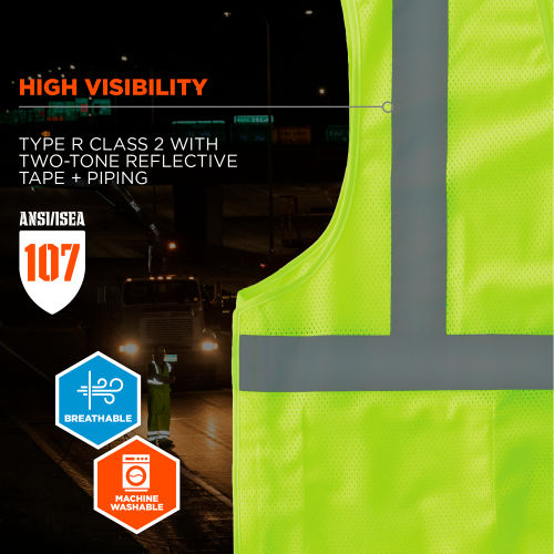 The GloWear 8215BA-S Mesh Hi-Vis Safety Vest is an ANSI 107 Type R, Class 2 vest made of 3.3oz polyester mesh with breakaway hook & loop on shoulders and sides for safety from snag hazards and moving parts. This hi-vis vest features 2 reflective tape for enhanced low-light visibility, plus a lower interior pocket and single mic tab. A hook & loop closure makes for easy on and off. SINGLE SIZING This vest is available in single sizes to allow workers to order their exact size for a more tailored, performance-style fit compared to dual-size vests (*tip: for best single-size fit, select one size down from your normal T-shirt size). The 8215BA Breakaway Hi-Vis Safety Vest is our identical dual-size model for those who prefer a looser fit for wear over sweatshirts or jackets. This reflective safety vest is ideal for anyone requiring Type R, Class 2 apparel, including road construction, baggage handling and municipalities. Features: HIGH VISIBILITY COMPLIANCE ANSI/ISEA 107, Type R Class 2 compliant with 2" reflective tape for low-light visibilityBREAKAWAY HOOK & LOOP On shoulders and sides for safety around snag hazards and moving partsLIGHTWEIGHT BREATHABILITY 3.3oz polyester meshEASY ON & OFF Hook & loop closureLOWER INTERIOR POCKET For storage of pens, notepads, etc.MIC TAB For convenient radio accessSINGLE SIZING Allows workers to order their exact size for optimal fit (*tip: select one size down from your normal T-shirt size)MACHINE WASHABLE.
