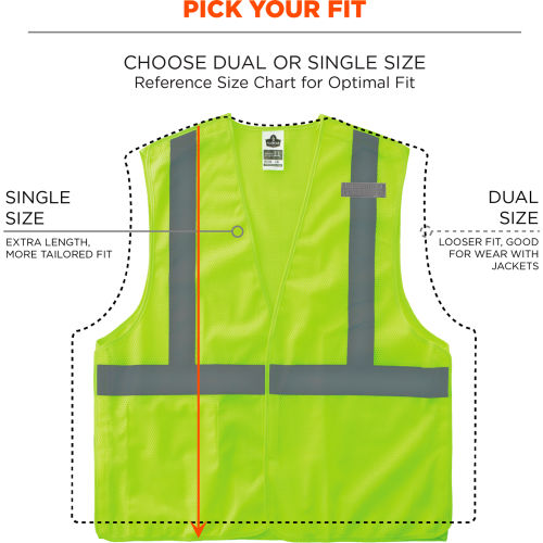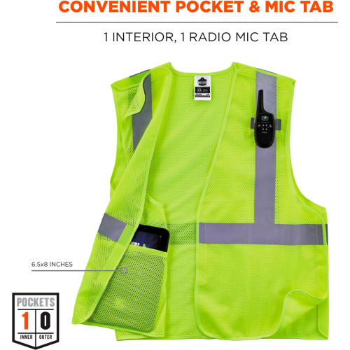 The GloWear 8215BA-S Mesh Hi-Vis Safety Vest is an ANSI 107 Type R, Class 2 vest made of 3.3oz polyester mesh with breakaway hook & loop on shoulders and sides for safety from snag hazards and moving parts. This hi-vis vest features 2 reflective tape for enhanced low-light visibility, plus a lower interior pocket and single mic tab. A hook & loop closure makes for easy on and off. SINGLE SIZING This vest is available in single sizes to allow workers to order their exact size for a more tailored, performance-style fit compared to dual-size vests (*tip: for best single-size fit, select one size down from your normal T-shirt size). The 8215BA Breakaway Hi-Vis Safety Vest is our identical dual-size model for those who prefer a looser fit for wear over sweatshirts or jackets. This reflective safety vest is ideal for anyone requiring Type R, Class 2 apparel, including road construction, baggage handling and municipalities. Features: HIGH VISIBILITY COMPLIANCE ANSI/ISEA 107, Type R Class 2 compliant with 2" reflective tape for low-light visibilityBREAKAWAY HOOK & LOOP On shoulders and sides for safety around snag hazards and moving partsLIGHTWEIGHT BREATHABILITY 3.3oz polyester meshEASY ON & OFF Hook & loop closureLOWER INTERIOR POCKET For storage of pens, notepads, etc.MIC TAB For convenient radio accessSINGLE SIZING Allows workers to order their exact size for optimal fit (*tip: select one size down from your normal T-shirt size)MACHINE WASHABLE.
