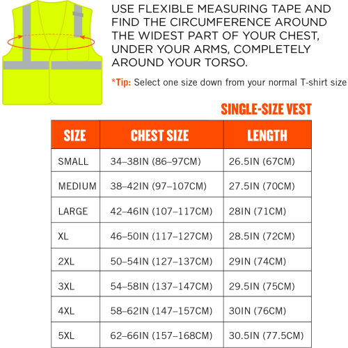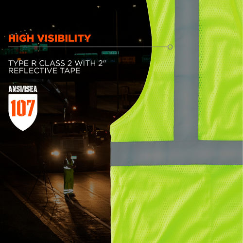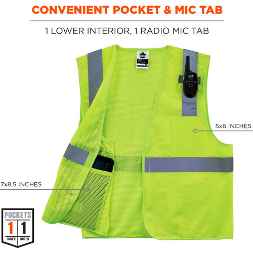The GloWear 8210HL-S Mesh Hi-Vis Safety Vest is an ANSI 107 Type R, Class 2 vest made of 3.3oz polyester mesh. This hi-vis vest features 2 reflective tape for enhanced low-light visibility, plus a lower interior pocket, exterior pocket and single mic tab. A hook & loop closure makes for easy on and off. SINGLE SIZING This vest is available in single sizes to allow workers to order their exact size for a more tailored, performance-style fit compared to dual-size vests (*tip: for best single-size fit, select one size down from your normal T-shirt size). The 8210HL Hi-Vis Safety Vest is our identical dual-size model for those who prefer a looser fit for wear over sweatshirts or jackets. This reflective safety vest is ideal for anyone requiring Type R, Class 2 apparel, including road construction, baggage handling and municipalities. Features: HIGH VISIBILITY ANSI/ISEA 107, Type R Class 2 certified with 2" reflective tape for low-light visibilityLIGHTWEIGHT BREATHABILITY 3.3oz polyester meshEASY ON & OFF Hook & loop closureSINGLE SIZING Allows workers to order their exact size for optimal fit (*tip: select one size down from your normal T-shirt size)LOWER INTERIOR + EXTERIOR POCKETS For storage of pens, notepads, etc.MIC TAB For convenient radio accessMACHINE WASHABLE.