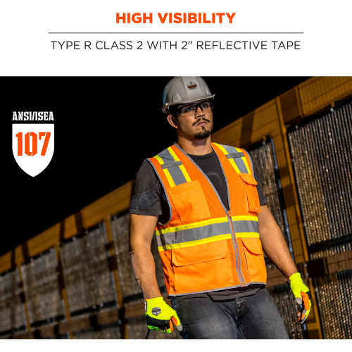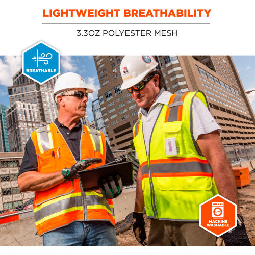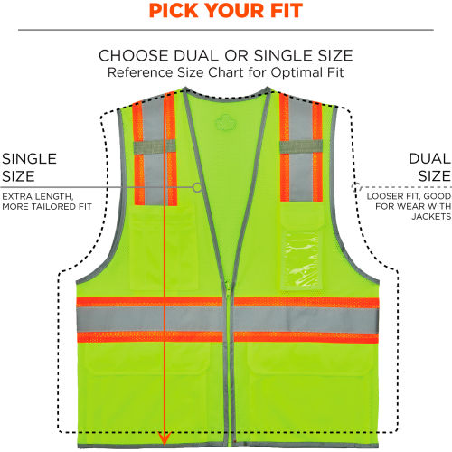The GloWear 8246Z-S Mesh Two-Tone Hi-Vis Safety Vest is an ANSI 107 Type R, Class 2 vest made of 3.3oz polyester mesh. This hi-vis vest features 2 reflective tape set on a 3.5 contrasting mesh background and reflective piping for enhanced low-light visibility. Built for storage, this vest has two inside and four outside pockets, a clear ID badge holder and dual radio mic tabs. A zipper closure makes for easy on and off. SINGLE SIZING This vest is available in single sizes to allow workers to order their exact size for a more tailored, performance-style fit compared to dual-size vests (*tip: for best single-size fit, select one size down from your normal T-shirt size). The 8246Z Two-Tone Hi-Vis Safety Vest is our identical dual-size model for those who prefer a looser fit for wear over sweatshirts or jackets. This reflective safety vest is ideal for anyone requiring Type R, Class 2 apparel, including road construction, baggage handling and municipalities. Features: HIGH VISIBILITY ANSI/ISEA 107, Type R Class 2 compliantTWO-TONE REFLECTIVE + PIPING 2" reflective tape on 3.5" contrasting mesh plus reflective piping for enhanced low-light visibilityLIGHTWEIGHT BREATHABILITY 3.3oz polyester meshEASY ON & OFF Zipper closurePOCKETS 2 interior, 4 exterior for maximum storageID BADGE HOLDER For easy access and identificationDUAL MIC TABS For convenient radio accessSINGLE SIZING Allows workers to order their exact size for optimal fit (*tip: select one size down from your normal T-shirt size)MACHINE WASHABLE.