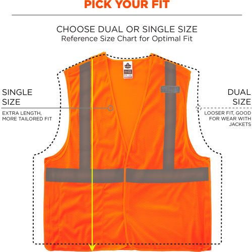 The GloWear 8215BA-S Mesh Hi-Vis Safety Vest is an ANSI 107 Type R, Class 2 vest made of 3.3oz polyester mesh with breakaway hook & loop on shoulders and sides for safety from snag hazards and moving parts. This hi-vis vest features 2 reflective tape for enhanced low-light visibility, plus a lower interior pocket and single mic tab. A hook & loop closure makes for easy on and off. SINGLE SIZING This vest is available in single sizes to allow workers to order their exact size for a more tailored, performance-style fit compared to dual-size vests (*tip: for best single-size fit, select one size down from your normal T-shirt size). The 8215BA Breakaway Hi-Vis Safety Vest is our identical dual-size model for those who prefer a looser fit for wear over sweatshirts or jackets. This reflective safety vest is ideal for anyone requiring Type R, Class 2 apparel, including road construction, baggage handling and municipalities. Features: HIGH VISIBILITY COMPLIANCE ANSI/ISEA 107, Type R Class 2 compliant with 2" reflective tape for low-light visibilityBREAKAWAY HOOK & LOOP On shoulders and sides for safety around snag hazards and moving partsLIGHTWEIGHT BREATHABILITY 3.3oz polyester meshEASY ON & OFF Hook & loop closureLOWER INTERIOR POCKET For storage of pens, notepads, etc.MIC TAB For convenient radio accessSINGLE SIZING Allows workers to order their exact size for optimal fit (*tip: select one size down from your normal T-shirt size)MACHINE WASHABLE.