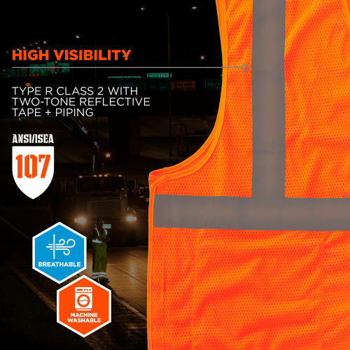 The GloWear 8215BA-S Mesh Hi-Vis Safety Vest is an ANSI 107 Type R, Class 2 vest made of 3.3oz polyester mesh with breakaway hook & loop on shoulders and sides for safety from snag hazards and moving parts. This hi-vis vest features 2 reflective tape for enhanced low-light visibility, plus a lower interior pocket and single mic tab. A hook & loop closure makes for easy on and off. SINGLE SIZING This vest is available in single sizes to allow workers to order their exact size for a more tailored, performance-style fit compared to dual-size vests (*tip: for best single-size fit, select one size down from your normal T-shirt size). The 8215BA Breakaway Hi-Vis Safety Vest is our identical dual-size model for those who prefer a looser fit for wear over sweatshirts or jackets. This reflective safety vest is ideal for anyone requiring Type R, Class 2 apparel, including road construction, baggage handling and municipalities. Features: HIGH VISIBILITY COMPLIANCE ANSI/ISEA 107, Type R Class 2 compliant with 2" reflective tape for low-light visibilityBREAKAWAY HOOK & LOOP On shoulders and sides for safety around snag hazards and moving partsLIGHTWEIGHT BREATHABILITY 3.3oz polyester meshEASY ON & OFF Hook & loop closureLOWER INTERIOR POCKET For storage of pens, notepads, etc.MIC TAB For convenient radio accessSINGLE SIZING Allows workers to order their exact size for optimal fit (*tip: select one size down from your normal T-shirt size)MACHINE WASHABLE.