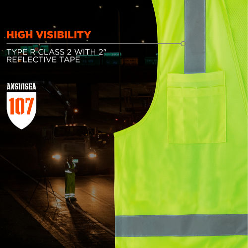 The GloWear 8249Z-S Hi-Vis Surveyors Vest is an ANSI 107 Type R, Class 2 vest with a 3.6oz polyester solid front and breathable 3.3oz polyester mesh back. This hi-vis vest features 2 reflective tape for enhanced low-light visibility. With two interior and two exterior pockets, including a cell phone chest pocket, this vest provides ample storage for pens, notebooks, tablets and more. A single mic tab allows convenient radio access, and a zipper closure makes for easy on and off. SINGLE SIZING This vest is available in single sizes to allow workers to order their exact size for a more tailored, performance-style fit compared to dual-size vests (*tip: for best fit, select one size down from your normal T-shirt size). The 8249Z Hi-Vis Surveyors Vest is our identical dual-size model for those who prefer a looser fit for wear over sweatshirts or jackets. This reflective safety vest is ideal for anyone requiring Type R, Class 2 apparel. Features: HIGH VISIBILITY ANSI/ISEA 107, Type R Class 2 compliant with 2" reflective tape for low-light visibilitySOLID FRONT & MESH BACK Lightweight 3.6oz polyester solid front with breathable 3.3oz polyester mesh backEASY ON & OFF Zipper closurePOCKETS 2 interior, 2 exterior for storage of cell phones, tablets, pens and moreMIC TAB For convenient radio accessSINGLE SIZING Allows workers to order their exact size for optimal fit (*tip: select one size down from your normal T-shirt size)MACHINE WASHABLE.