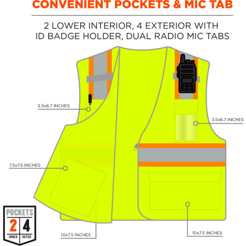 The GloWear 8246Z-S Mesh Two-Tone Hi-Vis Safety Vest is an ANSI 107 Type R, Class 2 vest made of 3.3oz polyester mesh. This hi-vis vest features 2 reflective tape set on a 3.5 contrasting mesh background and reflective piping for enhanced low-light visibility. Built for storage, this vest has two inside and four outside pockets, a clear ID badge holder and dual radio mic tabs. A zipper closure makes for easy on and off. SINGLE SIZING This vest is available in single sizes to allow workers to order their exact size for a more tailored, performance-style fit compared to dual-size vests (*tip: for best single-size fit, select one size down from your normal T-shirt size). The 8246Z Two-Tone Hi-Vis Safety Vest is our identical dual-size model for those who prefer a looser fit for wear over sweatshirts or jackets. This reflective safety vest is ideal for anyone requiring Type R, Class 2 apparel, including road construction, baggage handling and municipalities. Features: HIGH VISIBILITY ANSI/ISEA 107, Type R Class 2 compliantTWO-TONE REFLECTIVE + PIPING 2" reflective tape on 3.5" contrasting mesh plus reflective piping for enhanced low-light visibilityLIGHTWEIGHT BREATHABILITY 3.3oz polyester meshEASY ON & OFF Zipper closurePOCKETS 2 interior, 4 exterior for maximum storageID BADGE HOLDER For easy access and identificationDUAL MIC TABS For convenient radio accessSINGLE SIZING Allows workers to order their exact size for optimal fit (*tip: select one size down from your normal T-shirt size)MACHINE WASHABLE.