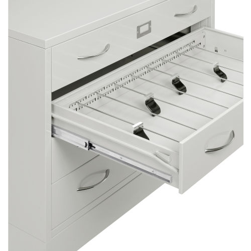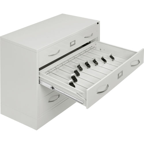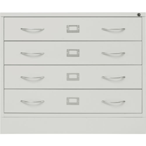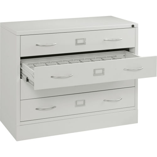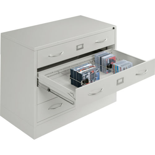 Interion Media Cabinet 4 Drawer Putty These Interion By Global Industrial heavy gauge welded steel cabinets allow you to mix and organize media the way you want it Cabinet measures 37"W x 17-1/2"D x 27-3/4"H. Optional Base adds 5" to height. Four 6"H drawers with full extension drawer glides. Putty finish. Interior drawer dimensions 34"W x 15"D x 4-1/4"H. Each drawer includes 6 front-to-back steel rod dividers that adjust at 1/2" increments and book end dividers that adjust at any point along the rod to securely hold media in place. The weight capacity per drawer is 85 lbs. Cylinder lock with 2 keys secures all drawers, chrome plated handles and 2-1/8"W x 1-1/8"H label holders. Cabinets stack for added storage. Comes Fully Assembled. 1 Year Limited Warranty.