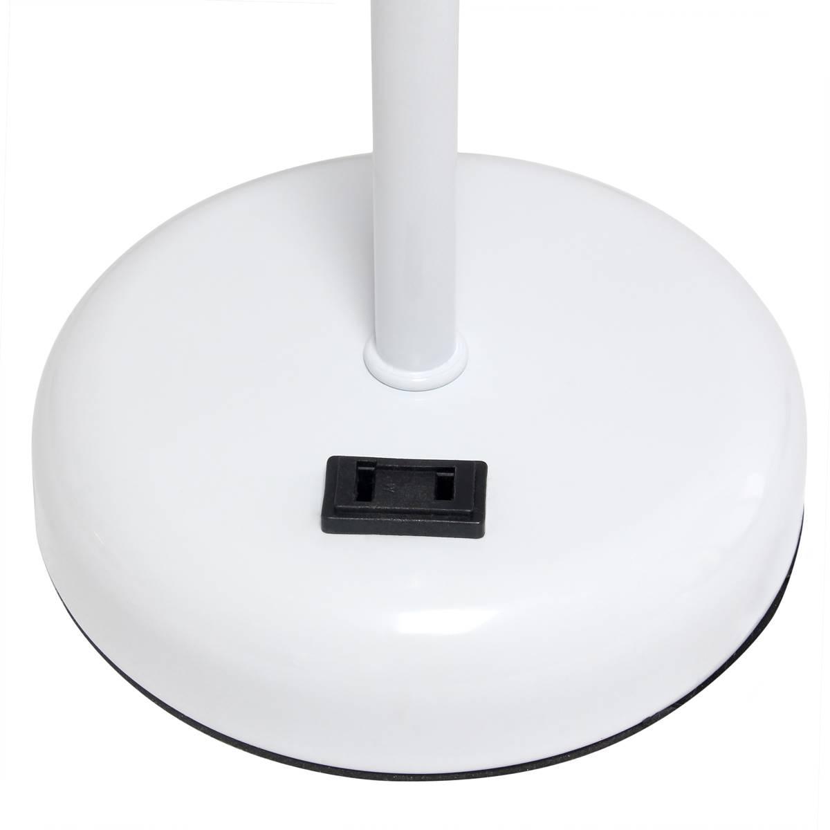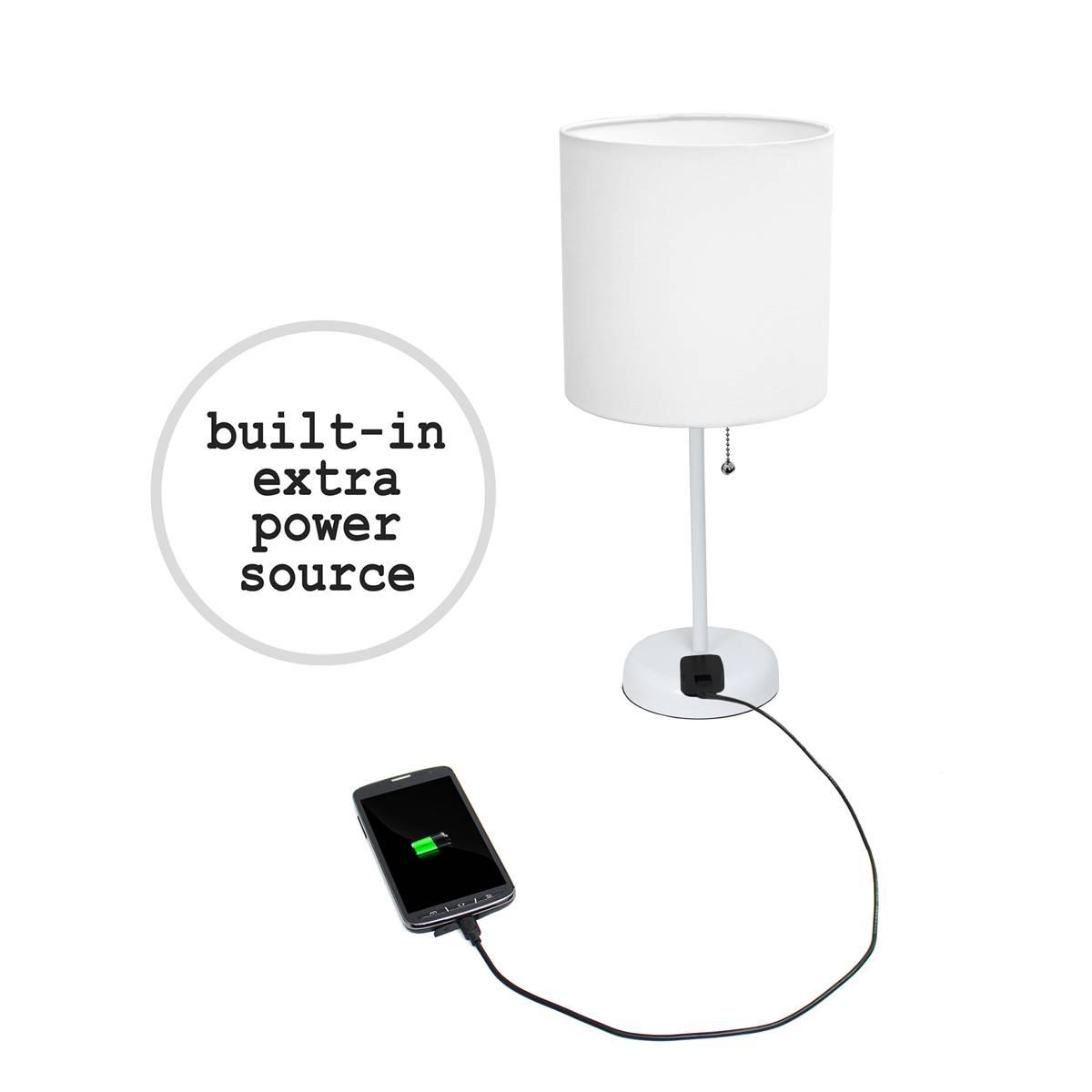 This LimeLights fun and fashionable lamp features abase and a fabric shade. It comes equipped with a 2 prong outlet seated in the base for use to charge mobile phones, handheld games, tablets, and other small electronics. This lamp will add a fabulous flair to any room. Perfect for bedrooms, kids and teens, college dorms, nurseries, or fun offices! White Base with Charging Outlet White Fabric Shade Shade Diameter: 8.5" x Height: 19.5" Uses 1 x 60W type A medium base bulb (not included) Power Outlet on base for charging your Cell phone, iPod, iPhone, iPad Material: Fabric 25%, Iron 69%, Plastic 6% Model LC2001-WOW-2PK Limited Manufacturer's Warranty.