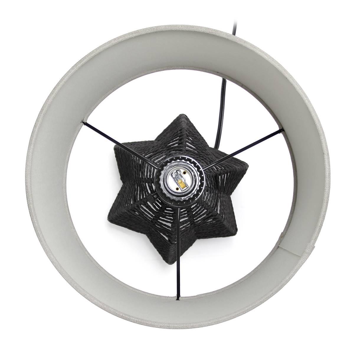 Layers of horizontal linear patterns made primarily of paper rope and metal create the impression and style of this vintage Lalia Home-inspired table lamp. Paired with a light grey linen shade, this combination is bound to compliment the existing fashion upheld in your home. This is the perfect piece to accent your home decor, whether in your living room, on your nightstand in your bedroom, or office! Collection: Organix Model LHT-4017 Light grey linen shadebase of paper rope Features a rotary switch on socket for convenience Shade measures 10.25"D x 9"H Features a 60" black plug in cord Material: 48% Linen Fabric, 25% Metal, 25% Paper Rope, 2% Plastic 1 Year Limited Against Manufacturer Defects.