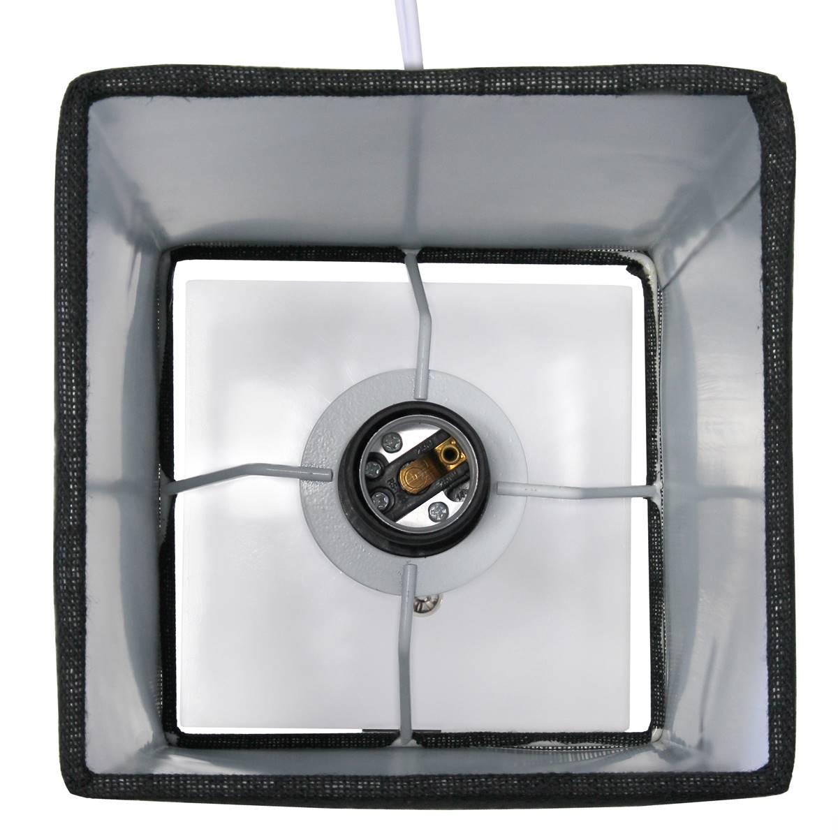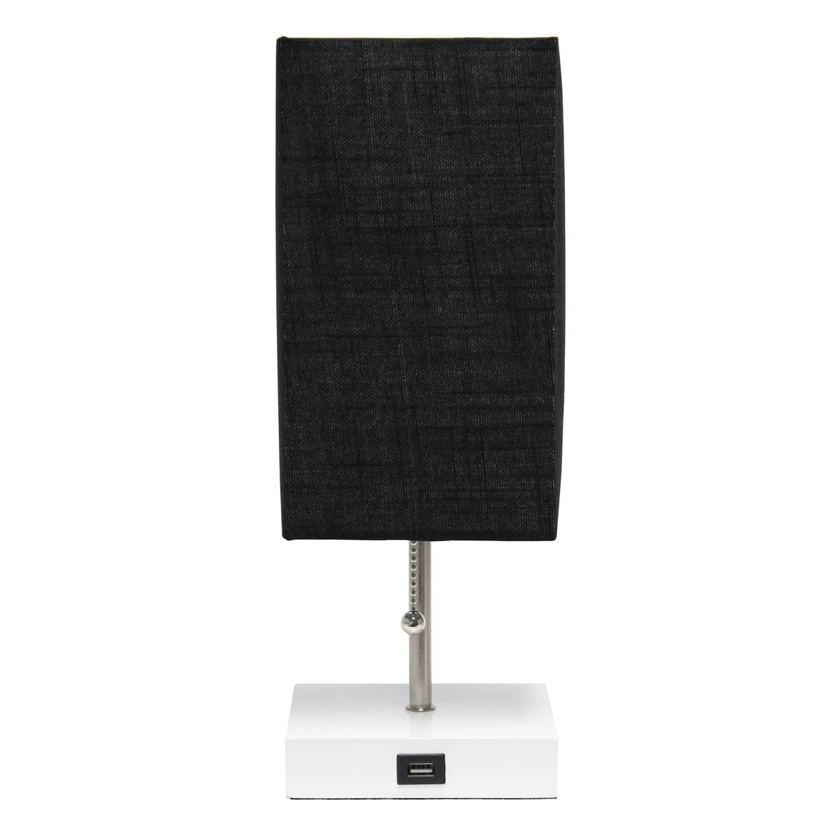 Simple yet fun, this Simple Designs fashionable table lamp features a white base and a fabric shade. It comes equipped with a USB seated in the base for use to charge tablets, mobile phones, handheld games, and other small electronics. This lamp will add a fabulous flair to any room. Perfect for kids and teens, bedrooms, college dorms, nurseries, or fun offices! Model LT1088 USB charging port on base Rectangular fabric shade Uses 1 x 40W type A medium base bulb (not included) LAMP IS A MINI LAMP - PLEASE SEE DETAILS FOR HEIGHT Material: Fabric 25%, Metal 20%, Wood/MDF 50%, Plastic 5% 1 Year Limited Against Manufacturer Defects.