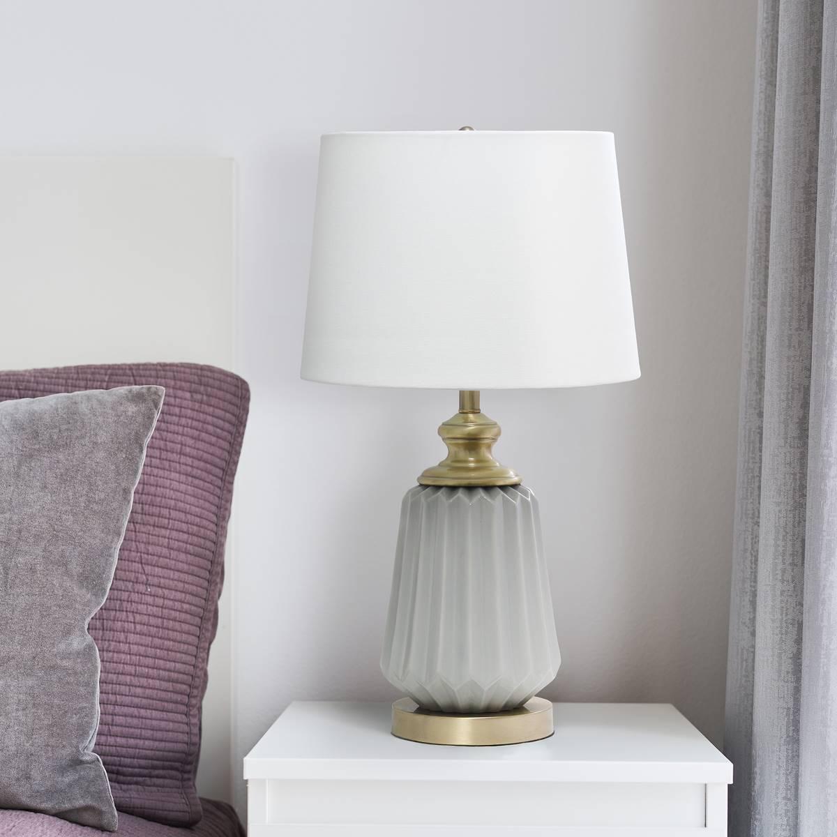 This Lalia Home classic traditional yet modern table lamp is sure to make a statement in your living room, bedroom, office, or foyer! The softceramic base is accented by antique bronze metal throughout to add a vintage touch but the crisp, white fabric shade sits atop to for a fresh, modern edge. Collection: Classix Model LHT-4007-GY Fluted softceramic base to fit into any decor Push pin switch on socket for convenience allowing a quick and easy on/off function as needed Crisp white fabric shade for a clean, fresh look Shade measures 14"D x 10"H Features a 60" black plug in cord Requires one 60 watt E26 medium base A19 bulb (not included) Material: 40% TC Fabric, 35% Ceramic, 20% Iron 5% Cord 1 Year Limited Against Manufacturer Defects.