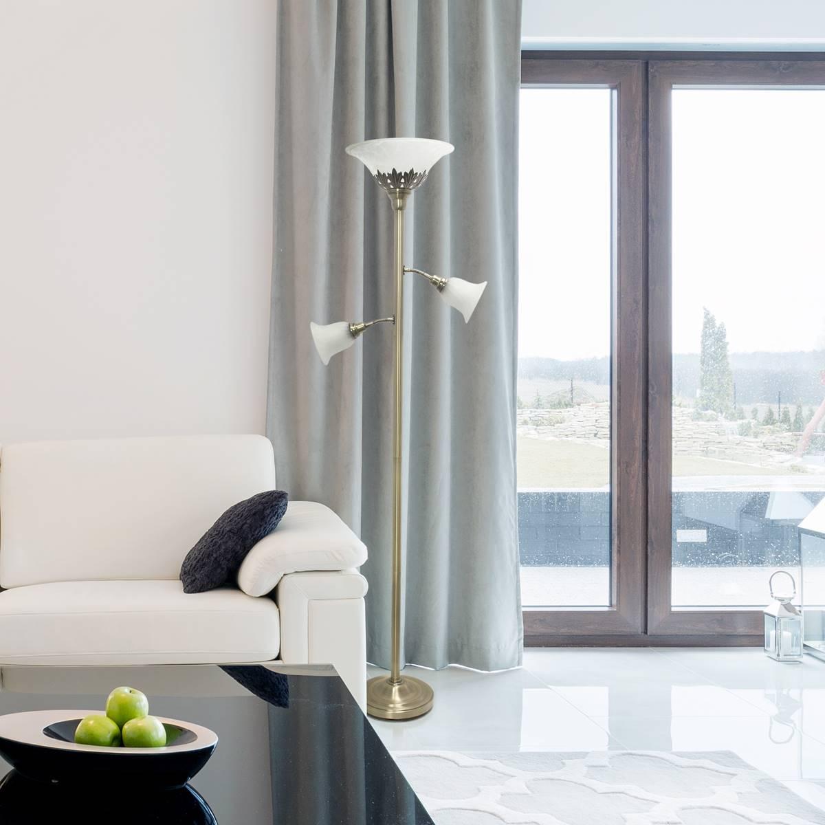 Brighten up your living space with this Lalia Home Classic elegant 3 light floor lamp. It features 2 adjustable reading lights to focus on the area of your choice. The beautiful metal base is accented by scalloped glass shades to complete the timeless look. Perfect for your office, bedroom, foyer or living room! Collection: Classix Model LHF-3002 White Spiraled Cut Glass Shades Polished Antique Brass finish Main Light requires 1 x 100W Medium Base Type A bulb (not included) Reading lights requires 2 x 60W Medium Base Type A bulbs (not included) 6ft. Black Cord 1 switch for all lights First Turn: Both reading lights will turn on Second Turn: Main Light Only Third Turn: All 3 lights on Fourth Turn: All lights off Material: 70% Iron, 25% Glass, 5% Others 1 Year Limited Against Manufacturer Defects.