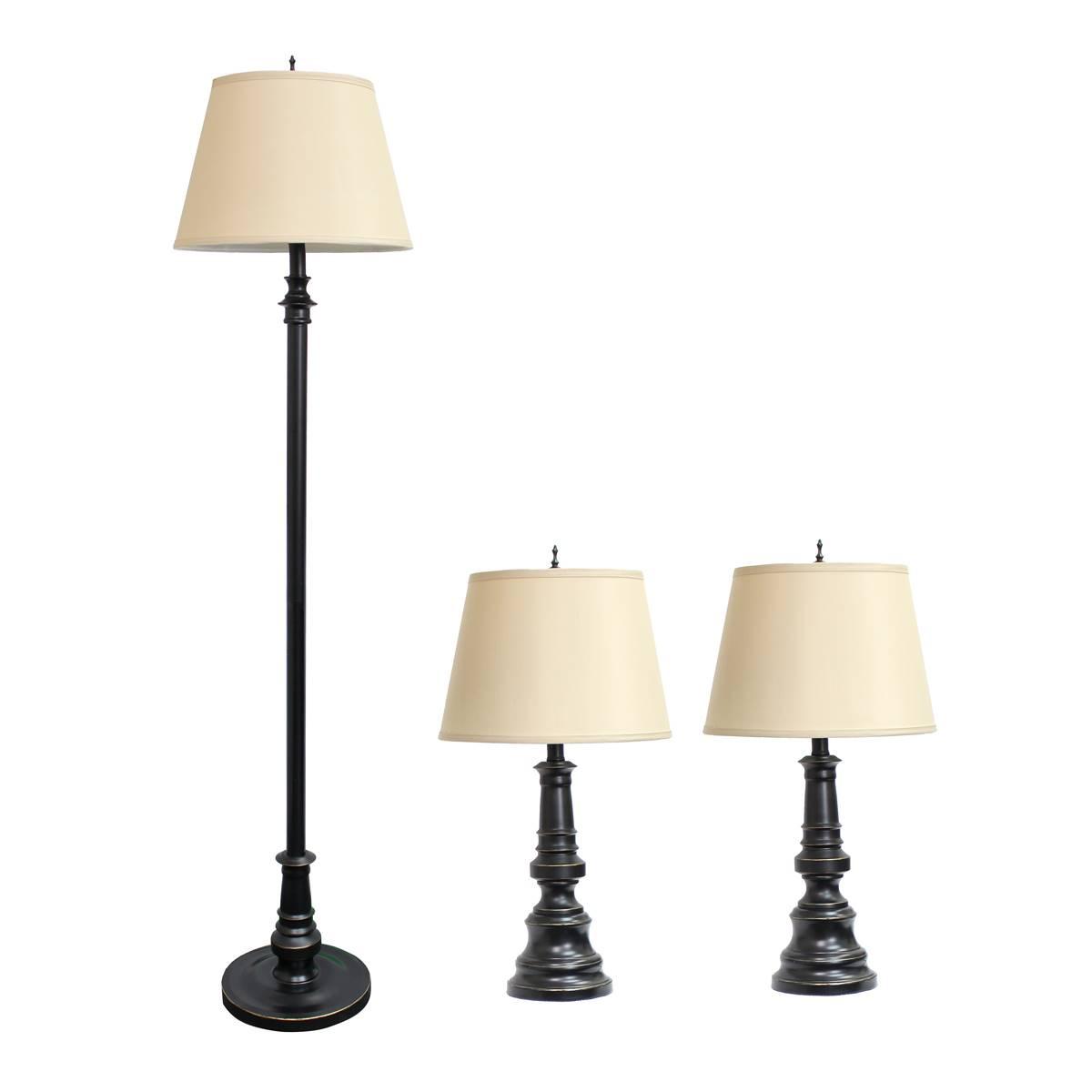 Decorate your home with this Lalia Home beautiful 3 piece matching table and floor lamp set! Thedetail embraces the curved lines and details throughout the base of each lamp, and is paired with a lovely tan fabric shade to bring you a warm, welcoming ambiance while satisfying your lighting needs. Perfect for a rustic, classic, industrial or style space! Collection: Homely Model LHS-1003-RZ Includes 3 x tan tapered drum fabric shades, for a warm feel Includes 2 x table and 1 x floor lampmetal bases Features a 3 way rotary switch on socket of each lamp Each lamp requires 1 x 100 watt type A19 medium based 3-way bulb (not included) Table lamp shade measures Diameter: 13.5" x 9.75"H Floor lamp shade measures Diameter: 14.5" x 10.25"H Lamp shade is secured using a matching finish harp & finial. Material: Iron 60%, Fabric 30%, Other 10% 1 Year Limited Against Manufacturer Defects This item requires oversize delivery. Please refer to the Order Summary in the Shipping step at checkout for delivery charge.