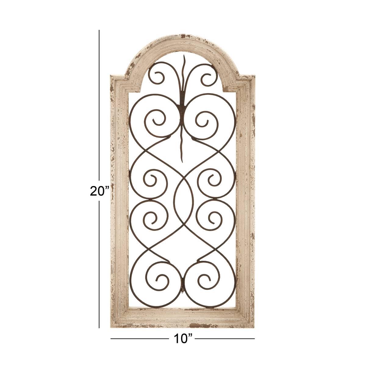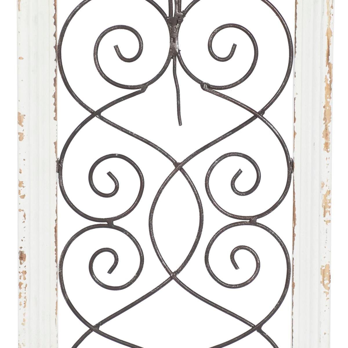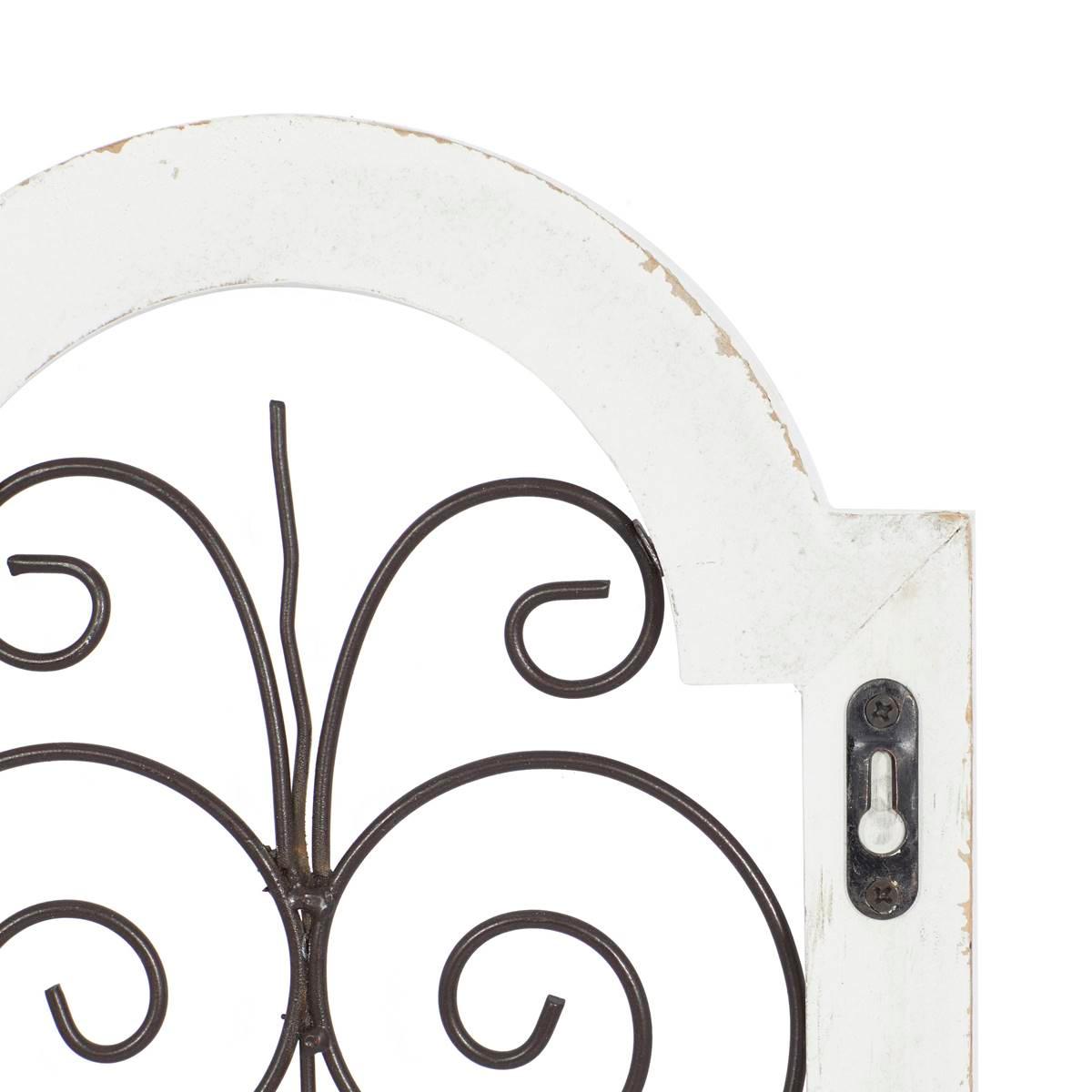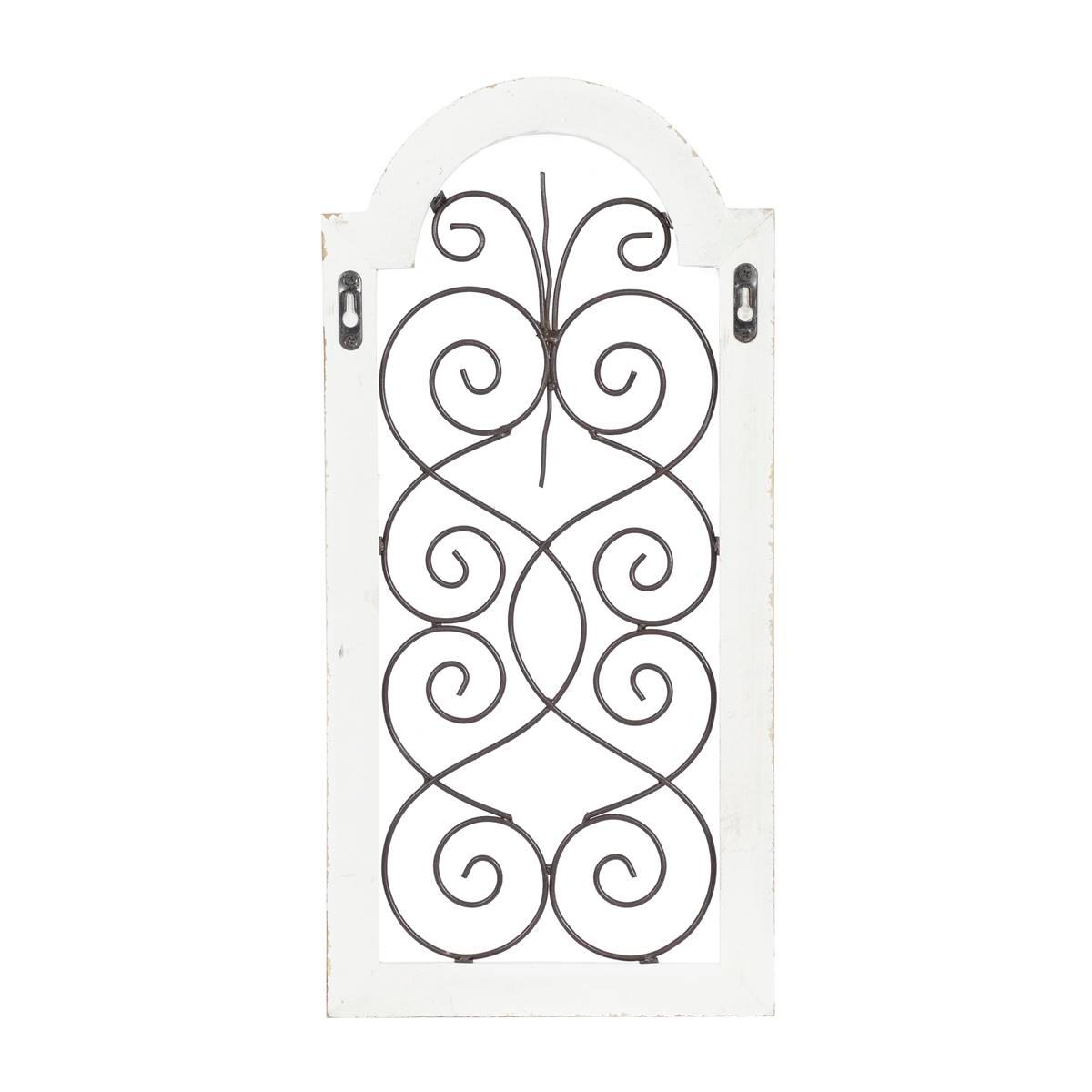 If you want a spacious feel in a smaller room, this 9th & Pike(R) small wood and iron wall decor is a perfect addition. The arched top of the distressed white frame housing black iron scrollwork forms a gate silhouette that creates a window-like feel when displayed on your wall. The shapes and finish bring a vintage feel while the neutral white and black tones will work with any color palette. Easy and ready to hang, this small wall decor piece will bring stylish dimensions and an antique feel to any room! This item requires oversize delivery. Please refer to the Order Summary in the Shipping step at checkout for delivery charge. Measures 20"H x10"W x 1"D To clean, wipe with a soft dry cloth.