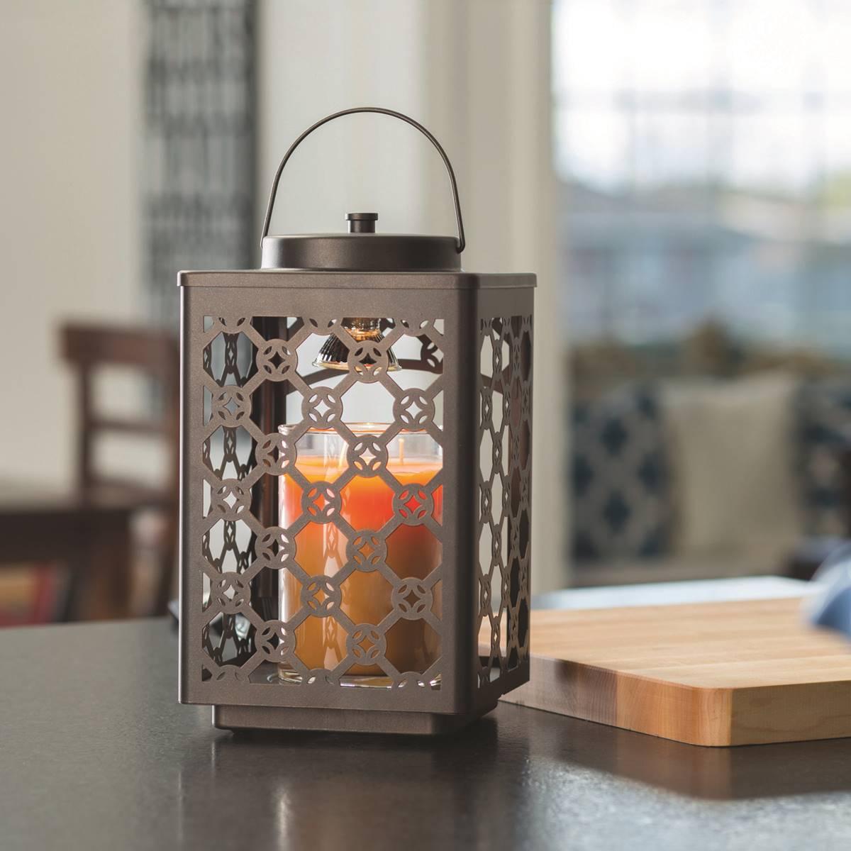 The Candle Warmers Etc. Garden Candle Warmer Lantern features elegant geometric cut-outs that cast an intricate pattern when lit. The matte-finished metal design comes in an oil rubbedfinish, lending a subtle flair of sophistication. This lantern uses a soft halogen bulb to warm a candle from the top down and allows you to enjoy the fragrance and ambiance of a lit candle, without flame, soot, or other pollutants. Place your favorite candle inside and enjoy the warm glow. Bulb is included. Limited Manufacturer's Warranty.