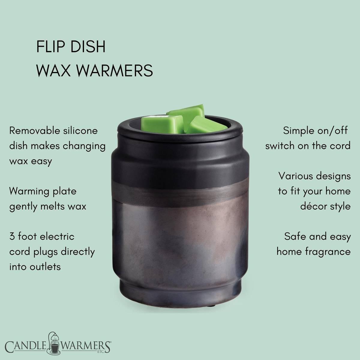 Home fragrance that pops! Literally! Make home fragrance a breeze with Candle Warmers Etc. black dipped flip dish wax warmer. The flexible silicone dish easily pops out cooled wax, so switching fragrances is a breeze! No more messing with hot wax or scraping cold wax out of a hard dish. Uses a warmer plate instead of a bulb. The electric ceramic warmer melts wax without flame or smoke.