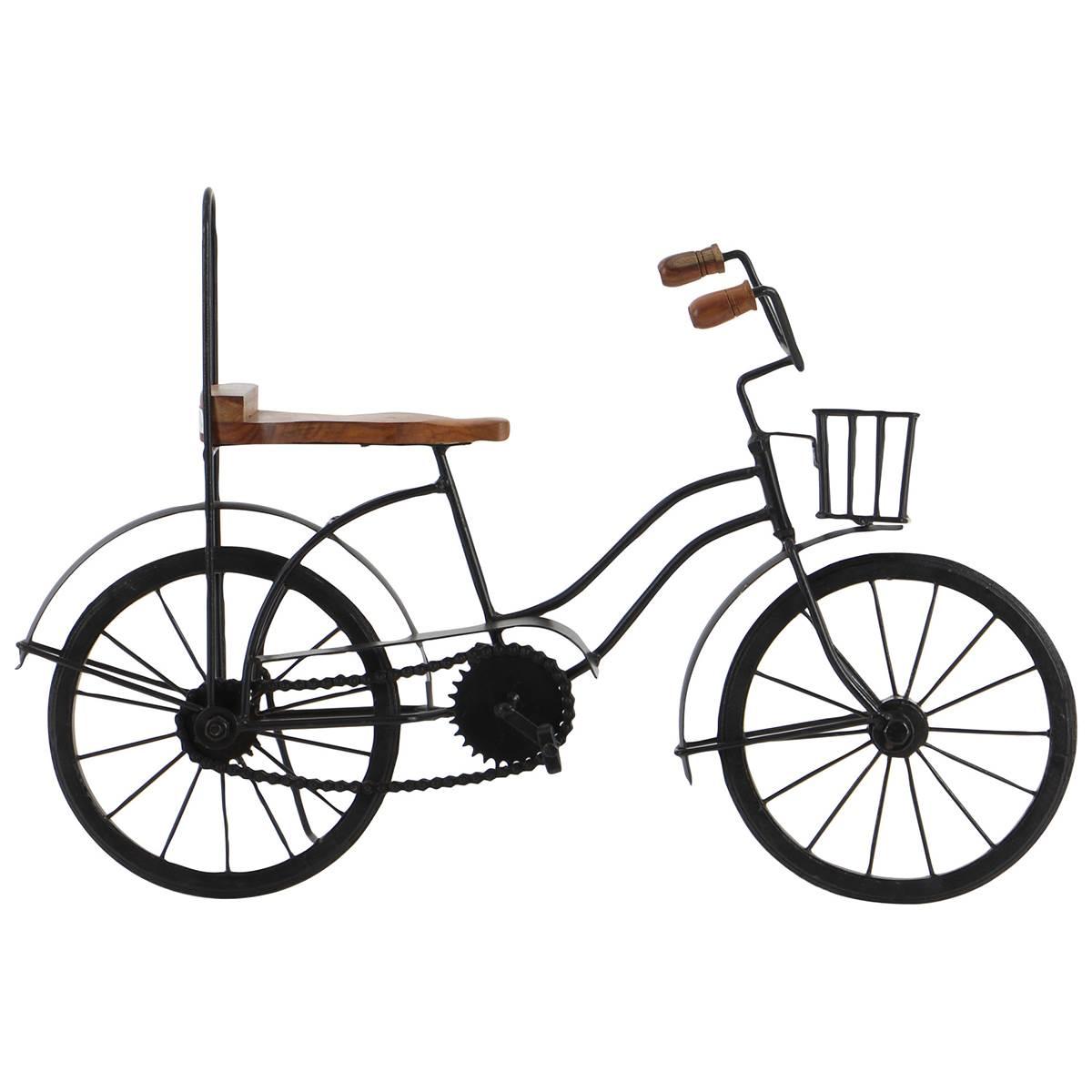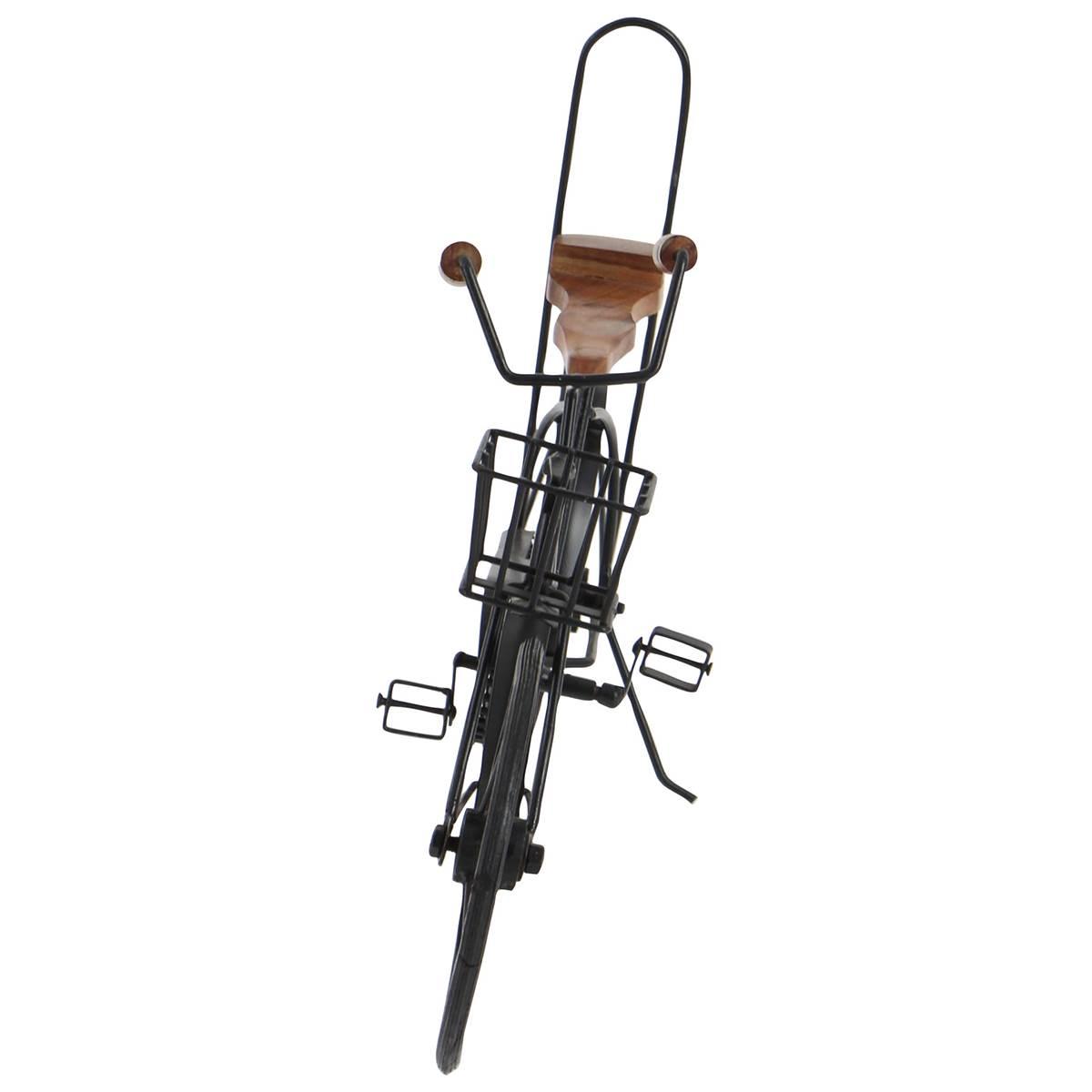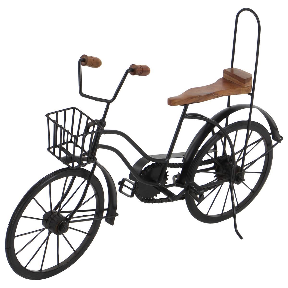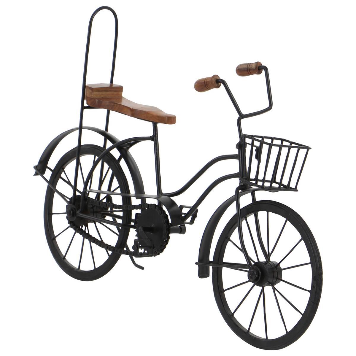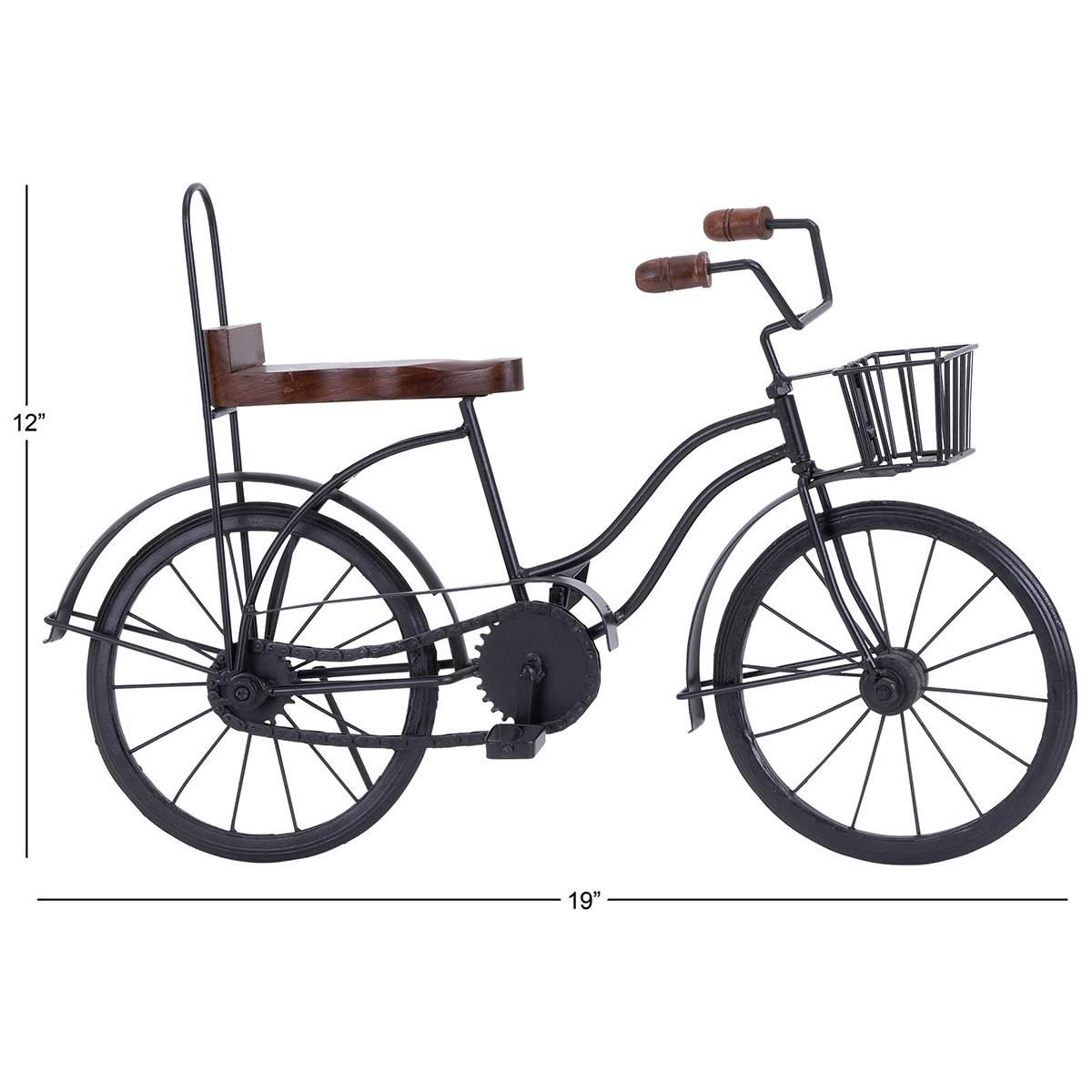 Dark tones with an antique vibe, this 9th & Pike(R) bicycle sculpture has a bold monochromefinish with a warm brown, natural wood seat and handlebars. Details include "granny" handlebars, fenders over the tires with spokes, bike chain and pedals, and a front basket. This vintage style table decor makes a great finishing touch on your desk, living room, or bedroom for cyclists and bicycle lovers. This item requires oversize delivery. Please refer to the Order Summary in the Shipping step at checkout for delivery charge.