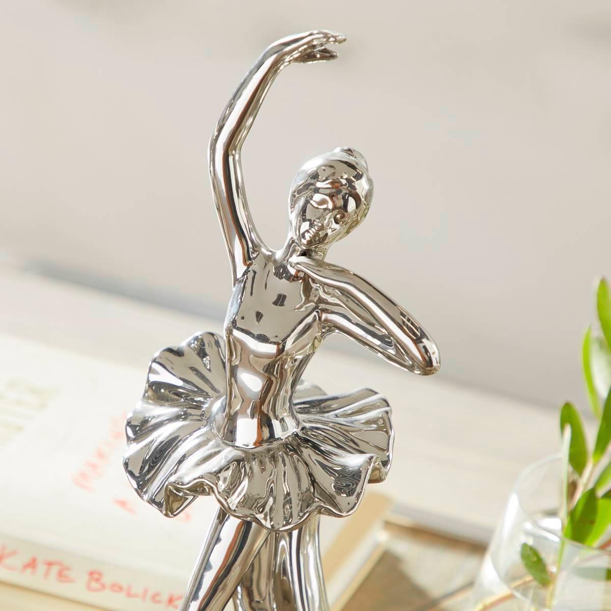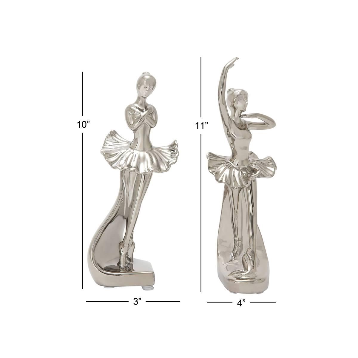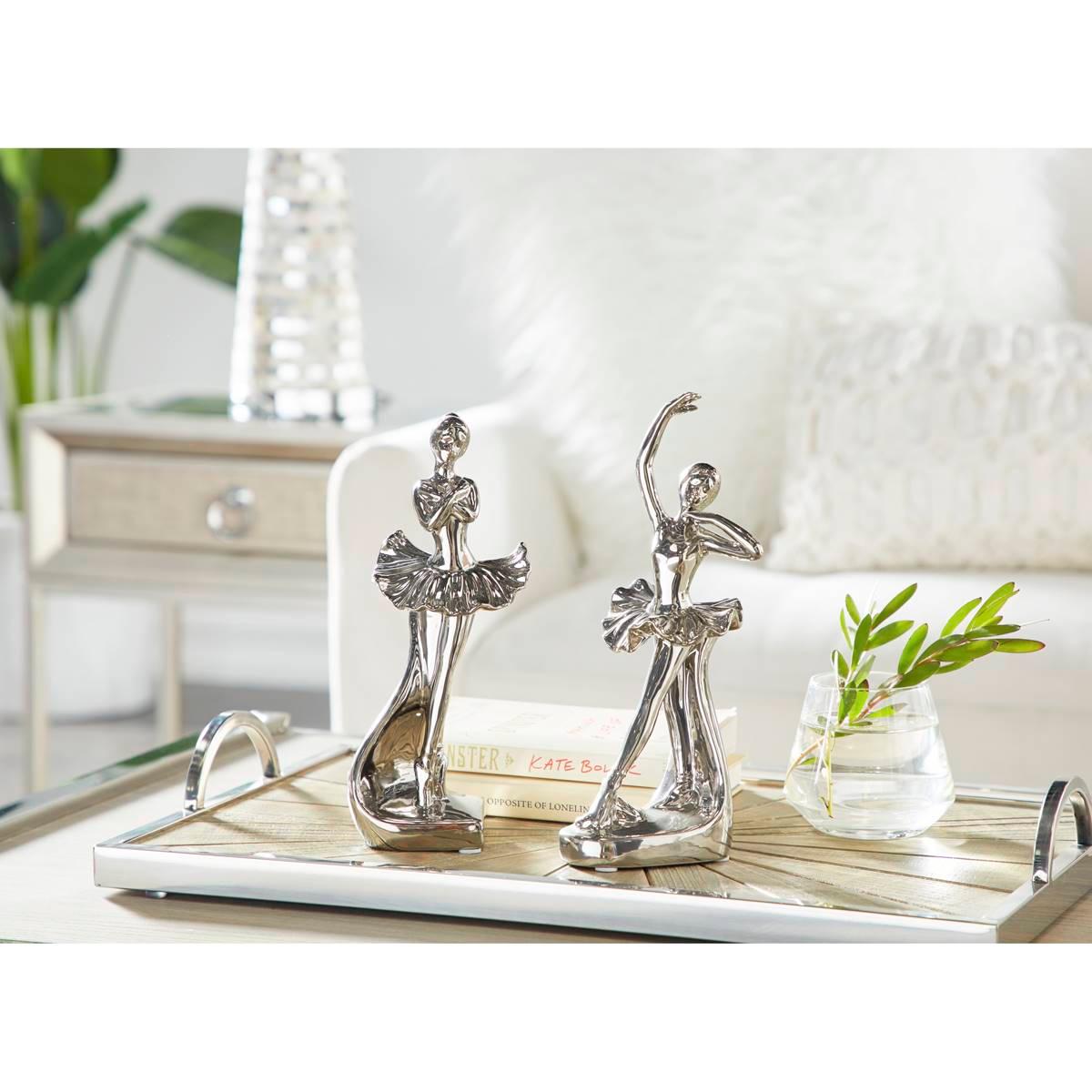 Sparkling in silver, this 9th & Pike(R) two dancing ballerina sculptures bring a dreamy elegant feel to any room. Each of the dancers is crafted from porcelain, one depicted in croise devant pose and the other with her arms and legs crossed. Both have highly-reflective, polished metallic silver finishes for a smooth metal look. Rubber stoppers beneath their bases prevent scuffing and sliding. This item requires oversize delivery. Please refer to the Order Summary in the Shipping step at checkout for delivery charge. Wipe with soft dry cloth.