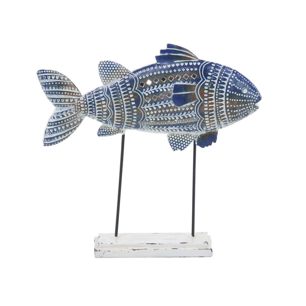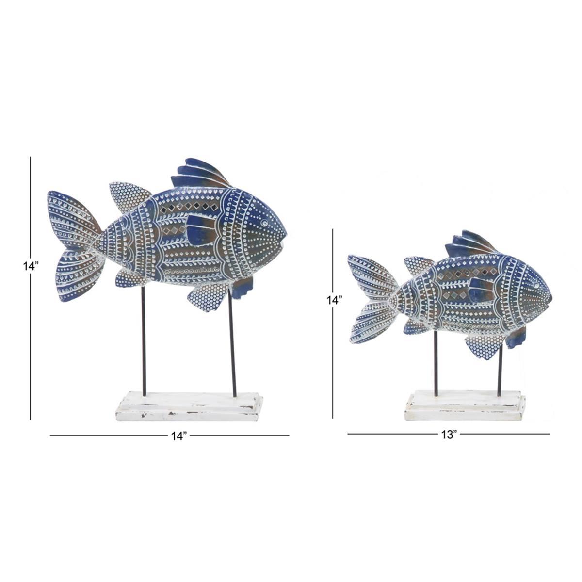 Add whimsy and an artsy feel to your coastal-styled home with this 9th & Pike(R) set of 2 gold and blue metal fish table decor sculptures, made from iron and adhered to iron frames. Each carved metal fish features eye, mouth, and fin details, gradient striped gold, and blue paint finishes, and carved boho patterns, including hearts, leaves, diamonds, and dots. Each fish is elevated by metal rods connected to each distressed white metal base for a prominent display. This set of fish table decor brings a beachy boho feel to your space! Set of 2: 13", 14". To clean, wipe with a soft dry cloth. This item requires oversize delivery. Please refer to the Order Summary in the Shipping step at checkout for delivery charge.