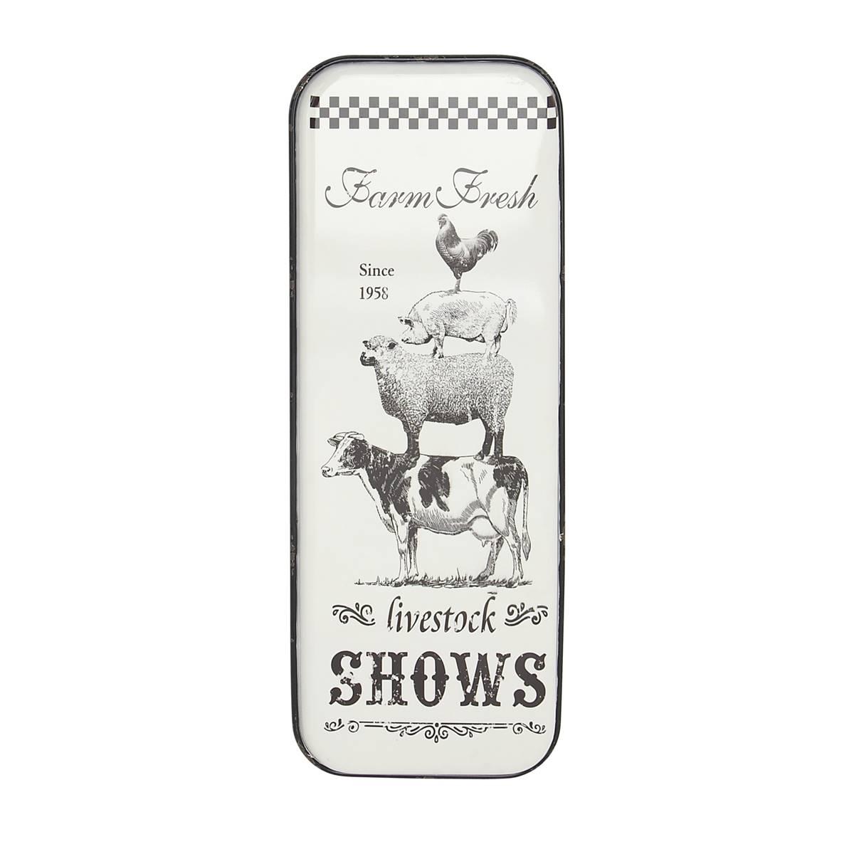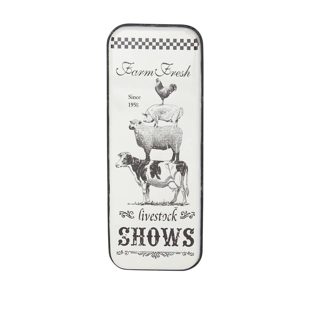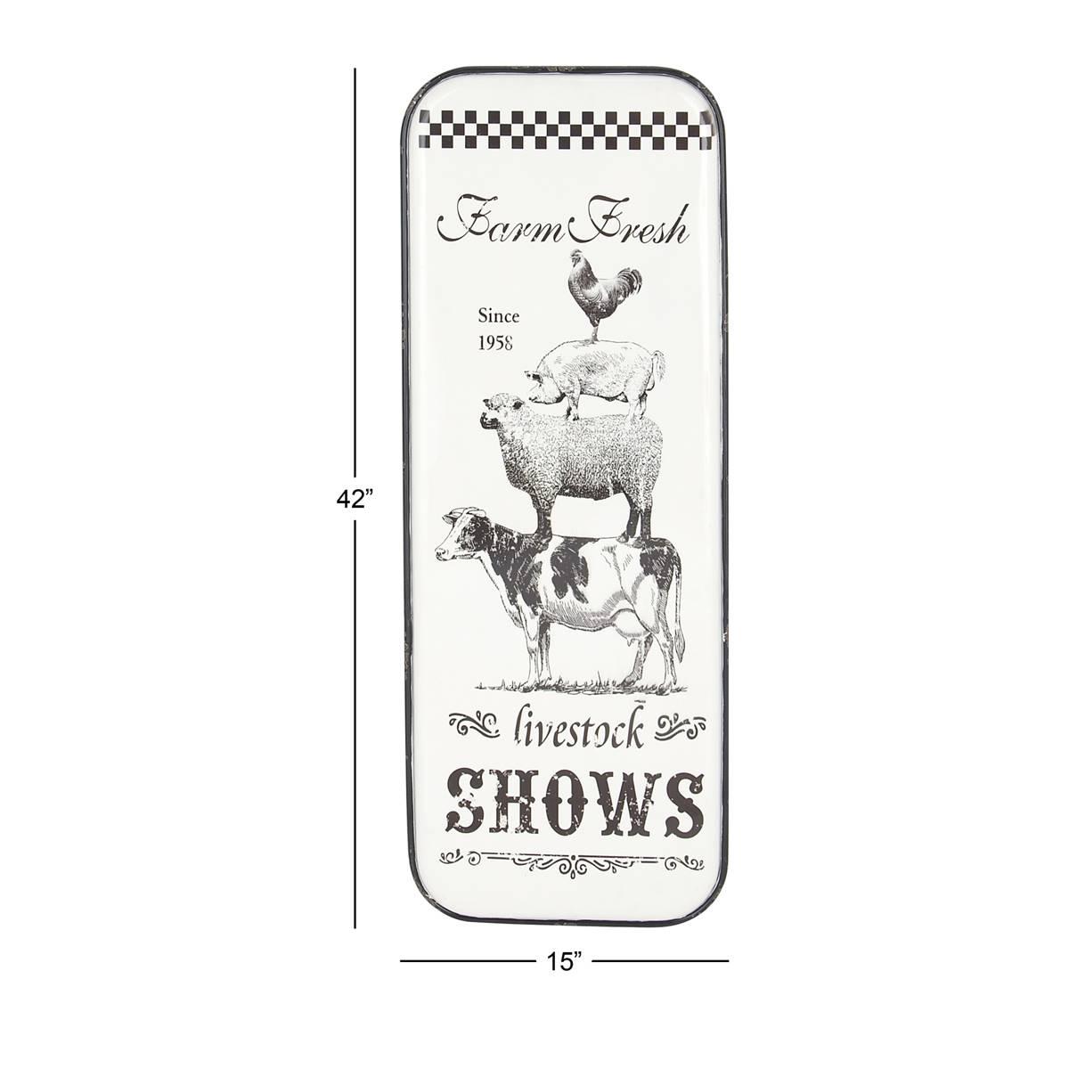 Transform your existing farmhouse, vintage, and rustic-inspired living home, with this vintage-inspired livestock animal wall sign. It showcases an oversized metal sign with 'Farmer's Market' inspired texts and livestock animal illustrations finish and a rectangular panel in glazed white finish. This item requires oversize delivery. Please refer to the Order Summary in the Shipping step at checkout for delivery charge.