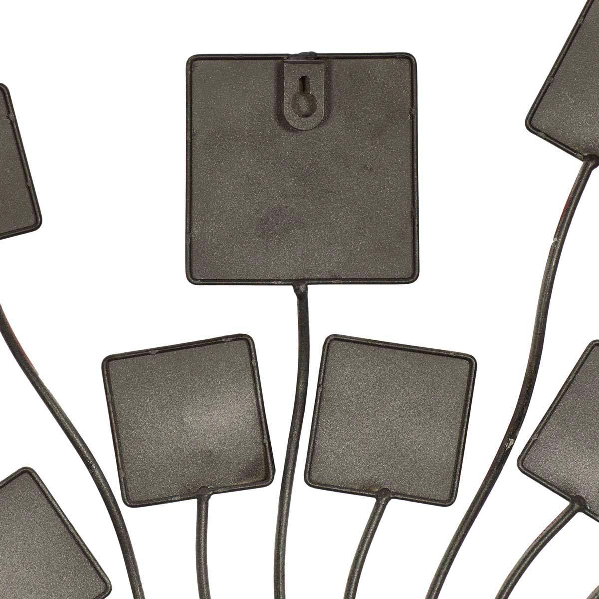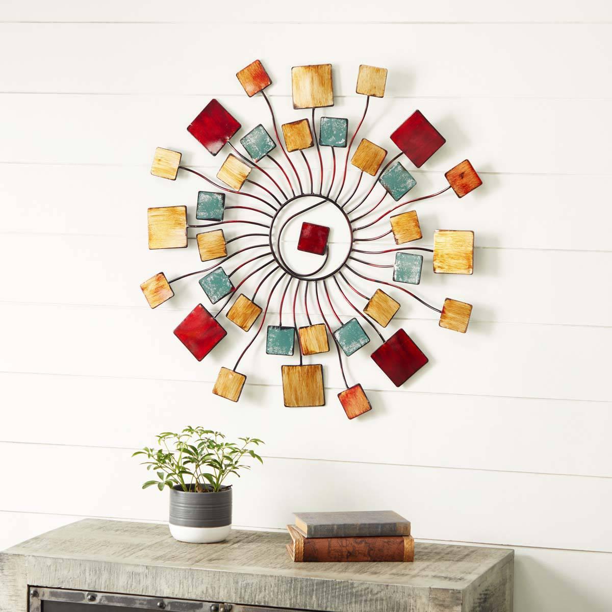 This 9th & Pike(R) Brown Modern round metal wall decor's staggered wavy lines add animated movement to walls with the addition of pops of texture and color. The latter feature comes from glossy brick red, metallic gold, pearly white, and Tiger's Eye resin accents forming a radial pattern. The center swirls to a close like a sun sculpture with a red square resin accent in the middle. This 32" accent decor makes a great statement piece in eclectic or contemporary style spaces. Display it via the keyhole backing. This item requires oversize delivery. Please refer to the Order Summary in the Shipping step at checkout for delivery charge.