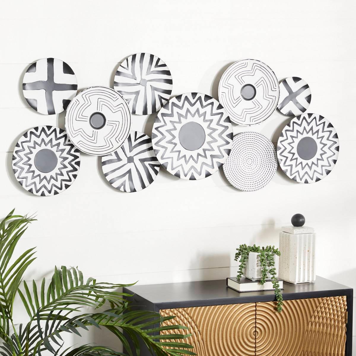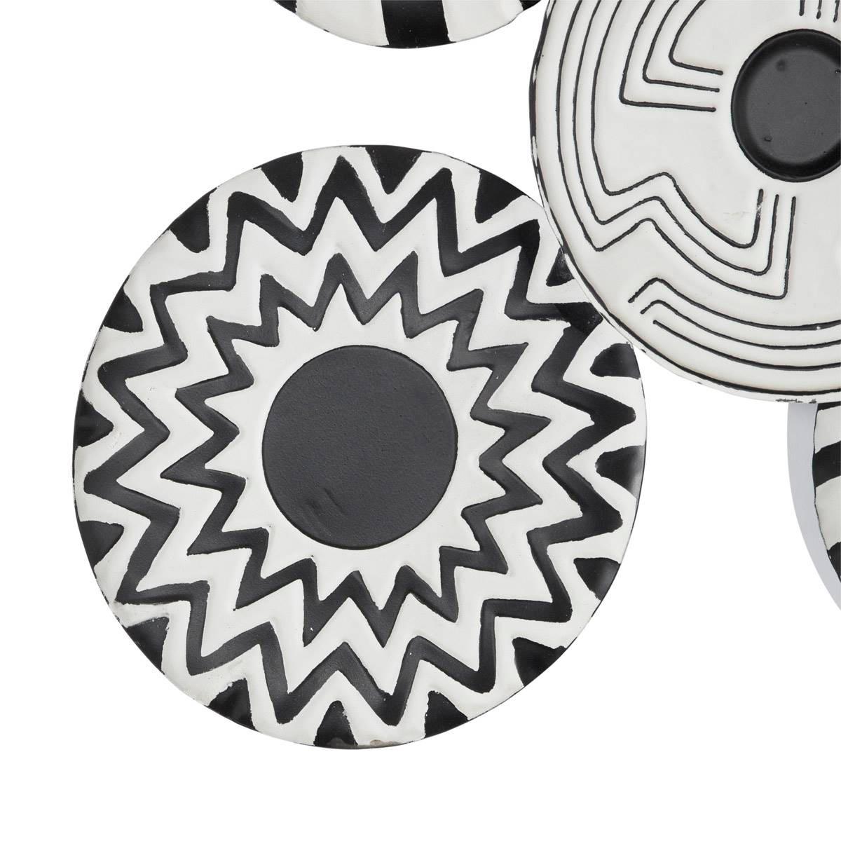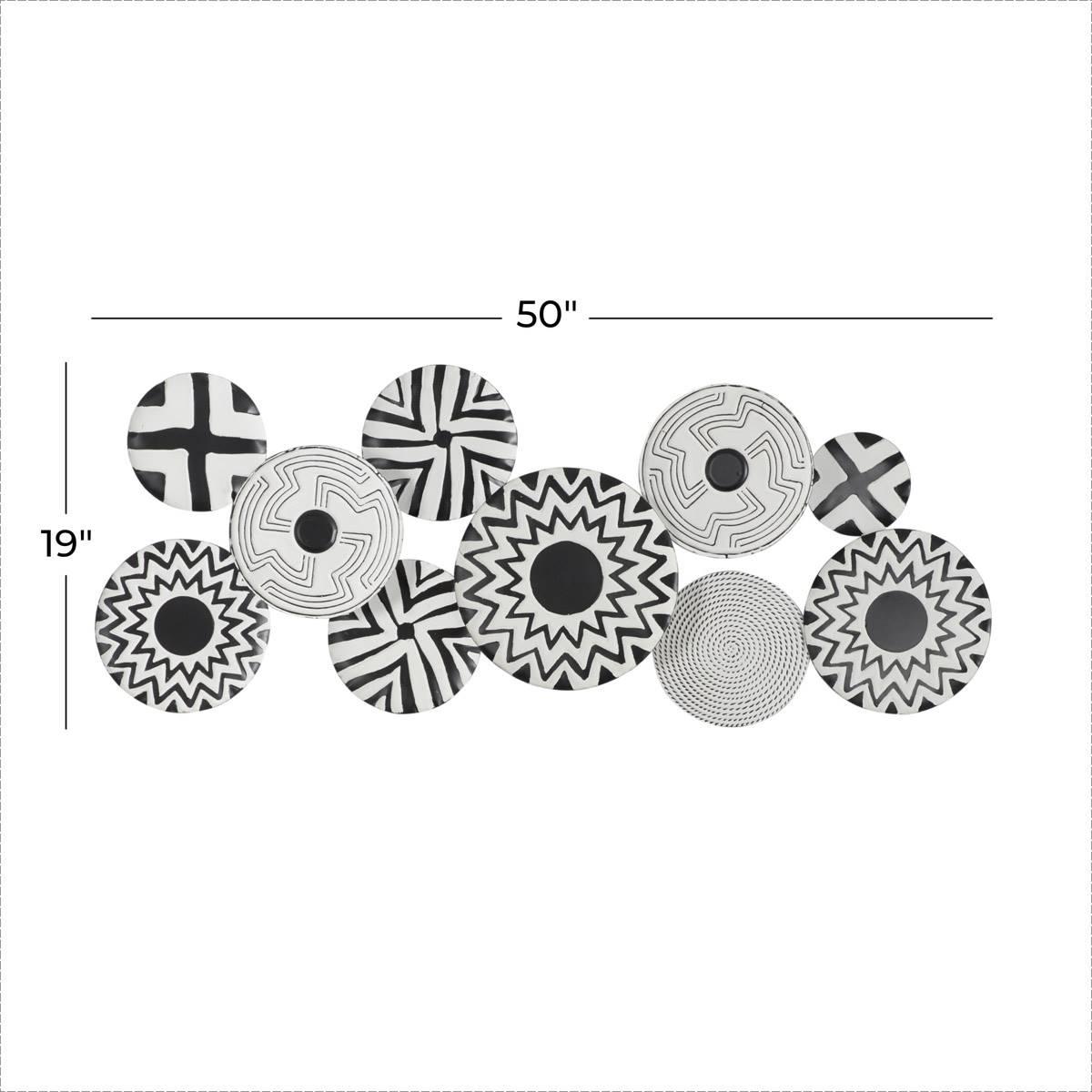 Liven up an empty wall with this 9th & Pike(R) contemporary home decor. The round wall decor is composed of a series of 10 metal discs, each disc features a bold and distinctand white design. Together, their abstract patterns form a stylish and unified look that will never fail to capture attention. This largeand white wall art is made of iron, and it's easy to hang in any room of your home thanks to the wall mounting features on the back of the discs. This item requires oversize delivery. Please refer to the Order Summary in the Shipping step at checkout for delivery charge.