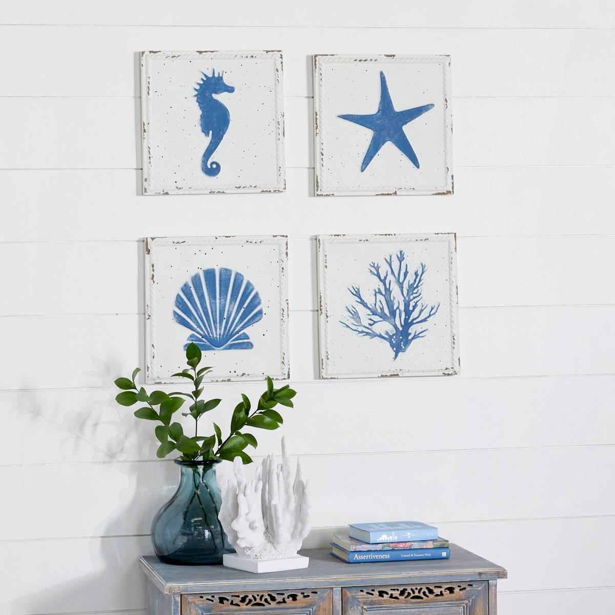 Add a modern coastal touch to your home with this set of blue andwood wall decor pieces from 9th & Pike(R). The set is crafted from natural wood material creating beautiful framed art pieces. This set has a distressedfinish and each features a seahorse, starfish, clam, and seagrass in cerulean blue. The set comes in 4 square artworks and is ideally hung together for a matching look. These are perfect accents for plain solid walls of contemporary and coastal-themed home interiors. This item requires oversize delivery. Please refer to the Order Summary in the Shipping step at checkout for delivery charge.