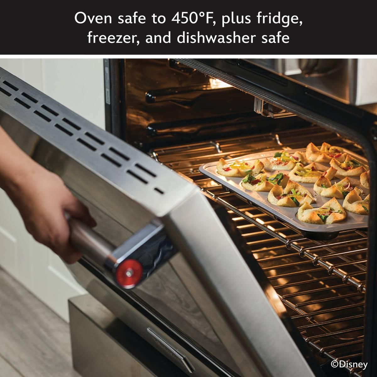 This Farberware(R) Disney Bake with Mickey nonstick 12-cup muffin pan is an exclusive collection of bakeware inspired by Disney's Mickey Mouse and brings the joy and fun of Disney into your kitchen. The 12-cup muffin pan features Mickey's iconic silhouette embossed into the base of each cup. Create homemade muffins, egg bites, pizza cups, and more with this durable muffin pan that reliably resists warping and heats evenly. The pan browns beautifully and helps reduce hot spots that can burn baked goods, while nonstick inside and out delivers great food release for muffins, cupcakes, oven-baked mini quiches, and savory small bites - all with quick cleanup. Oven safe to 450deg.F and dishwasher safe. Fridge and freezer safe. Quality Assurance Guarantee.