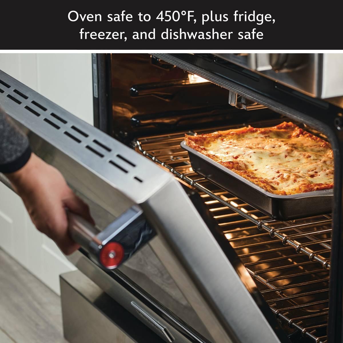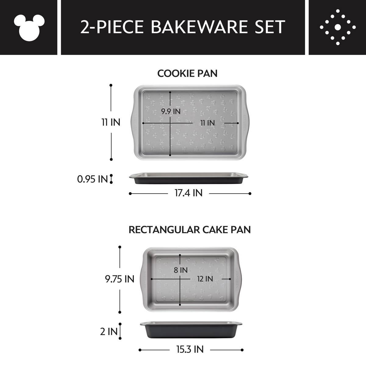 This Farberware(R) Disney Bake with Mickey 2-piece cake and cookie pan set is an exclusive collection of bakeware inspired by Disney's Mickey Mouse and brings the joy and fun of Disney into your kitchen. The 2-piece set includes a cake pan and a cookie sheet pan, featuring Mickey's iconic silhouette embossed into the baking surface. These durable baking pans reliably resist warping and heat evenly. They also brown beautifully and help reduce hot spots that can burn baked goods, while their nonstick cooking surfaces deliver great food release for sweet treats or savory meals - all with quick cleanup. This collection combines classic bakeware designs and contemporary functionality with more than 120 years of Farberware's trusted culinary performance and the nostalgic charm of classic Disney. (Copyright: Disney) Includes: 2"H x 15.3"W x 9.75"D Cake Pan, .95"H x 17.4"W x 11"D Cookie Pan Limited Manufacturer's Warranty.