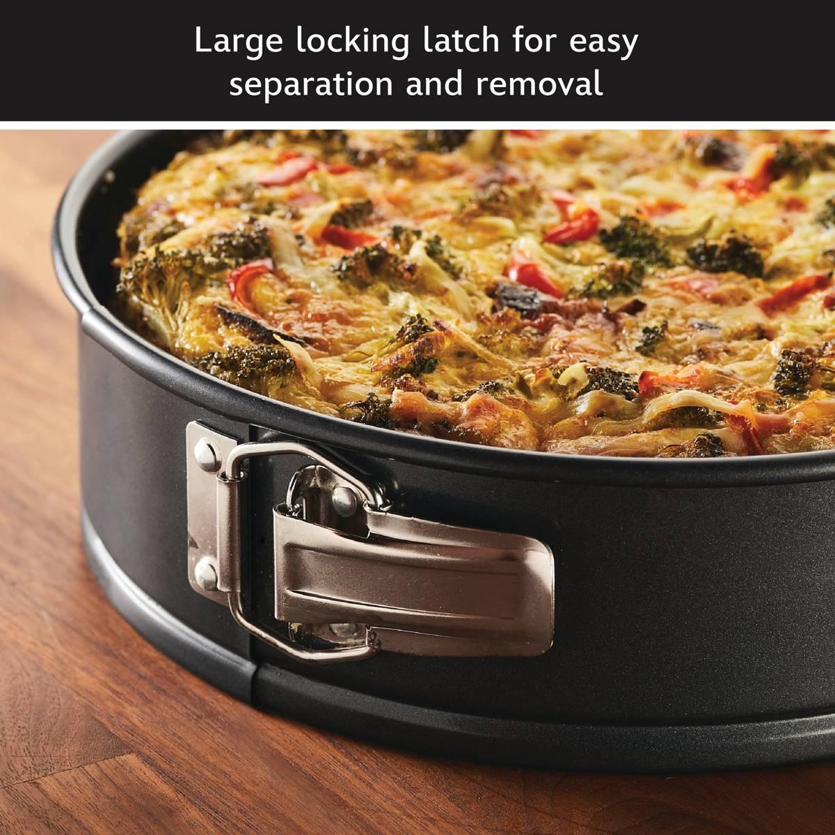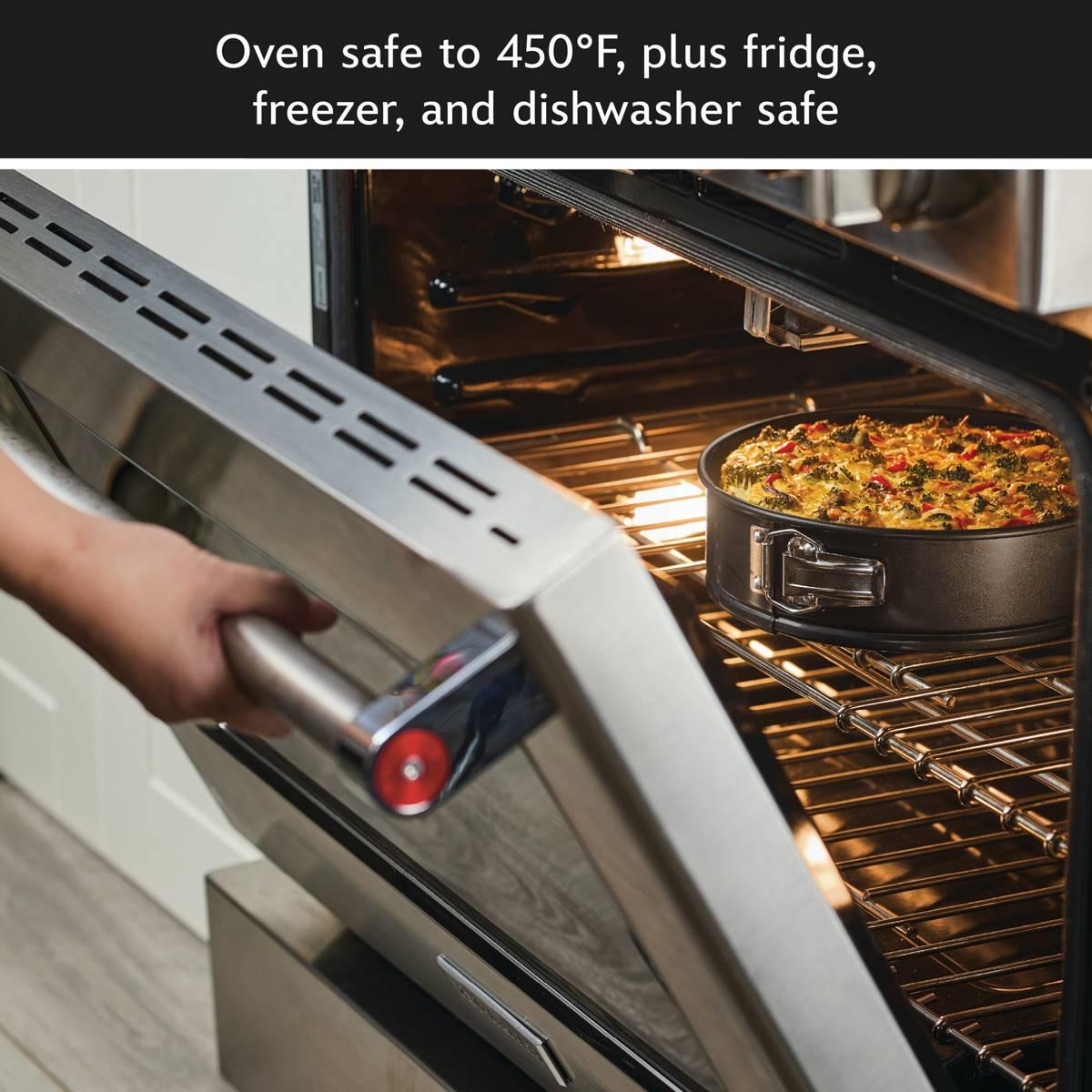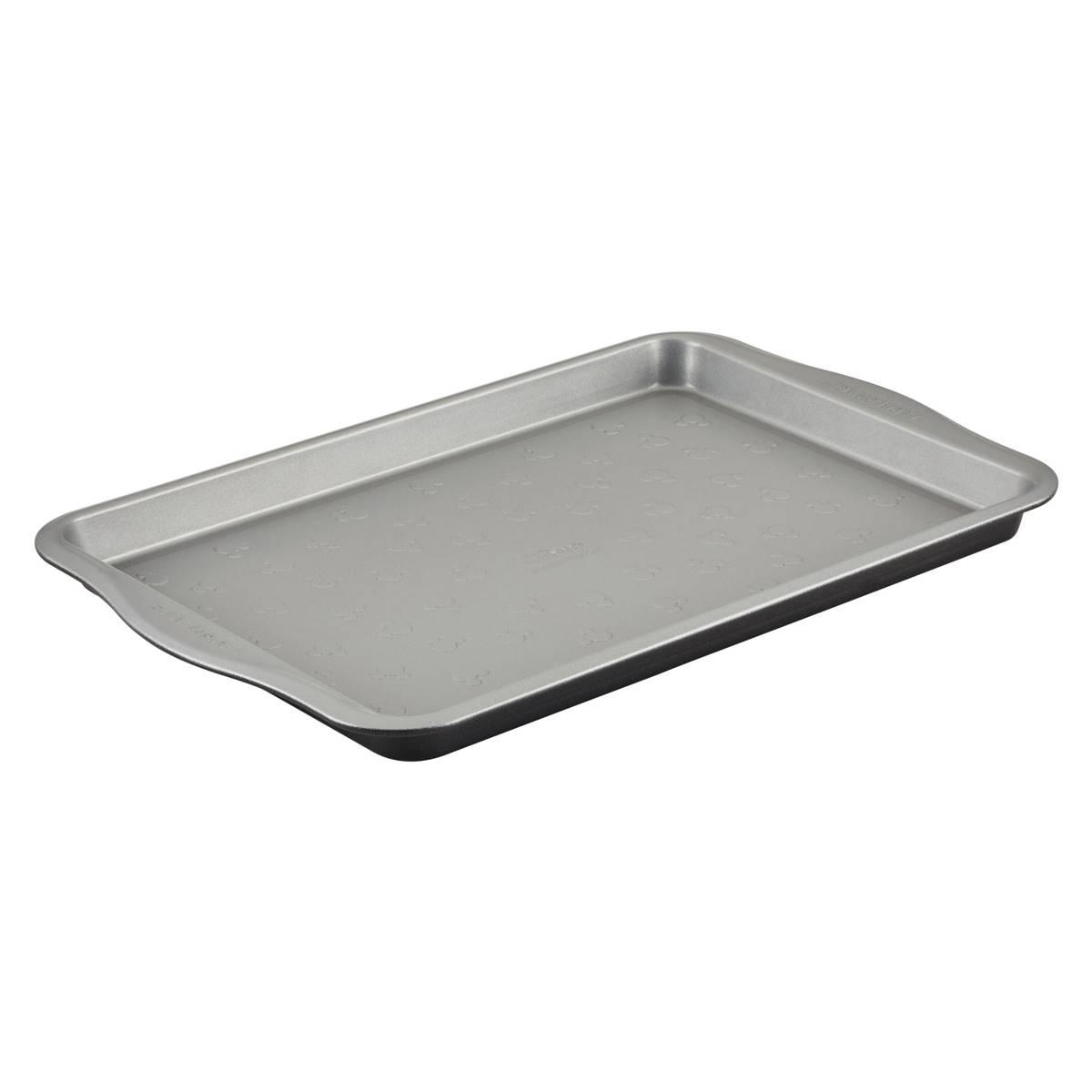 Create your favorite baked treats with this Farberware(R) Disney Bake with Mickey 2-piece pan and springform set - an exclusive collection of bakeware inspired by Disney's Mickey Mouse that brings the joy and fun of Disney into your kitchen. The 2-piece set includes a sheet pan and a round springform pan featuring Mickey's iconic silhouette embossed into the baking surface. These durable baking pans reliably resist warping and heat evenly. They also brown beautifully and help reduce hot spots that can burn baked goods, while their nonstick cooking surfaces deliver great food release for sweet treats or savory meals - all with quick cleanup. This collection combines classic bakeware designs and contemporary functionality with more than 120 years of Farberware(R)'s trusted culinary performance and the nostalgic charm of classic Disney. (Copyright: Disney). This product contains (Este producto contiene) Aluminum, Copper. For more information on chemicals in this product, visit (Para obtener mas informacion sobre productos quimicos en este producto, visite): https://farberwarecookware.com/pages/product-disclosures. Limited Manufacturer's Warranty. Includes: .95"H x 17.4"W x 11"D Cookie Pan, 2.6"H x 9.6"W x 9.6"D Round Springform.