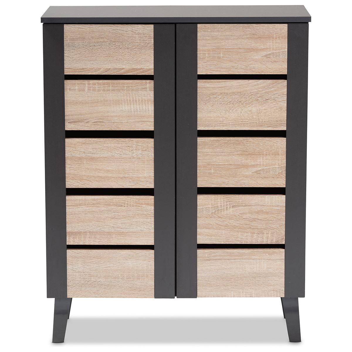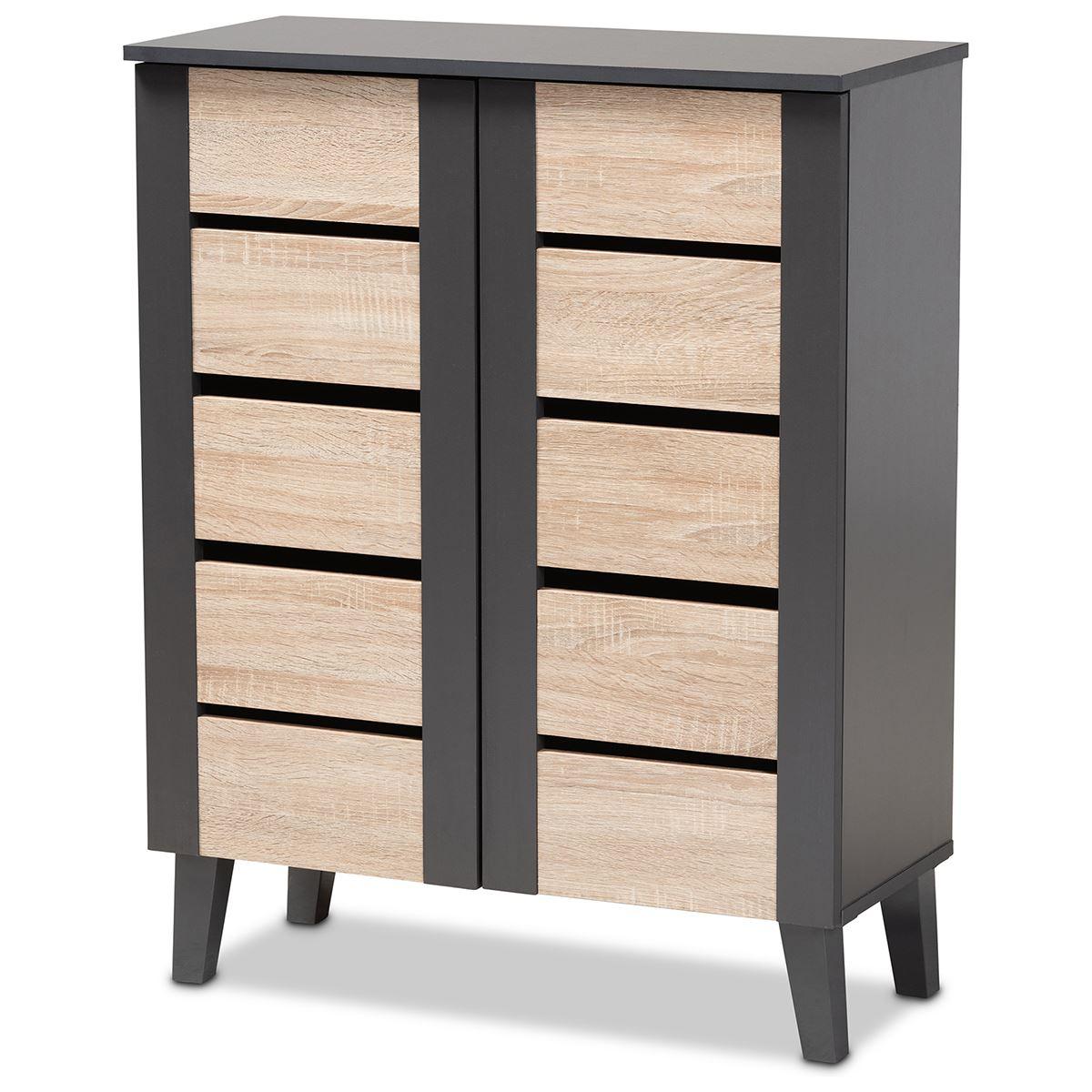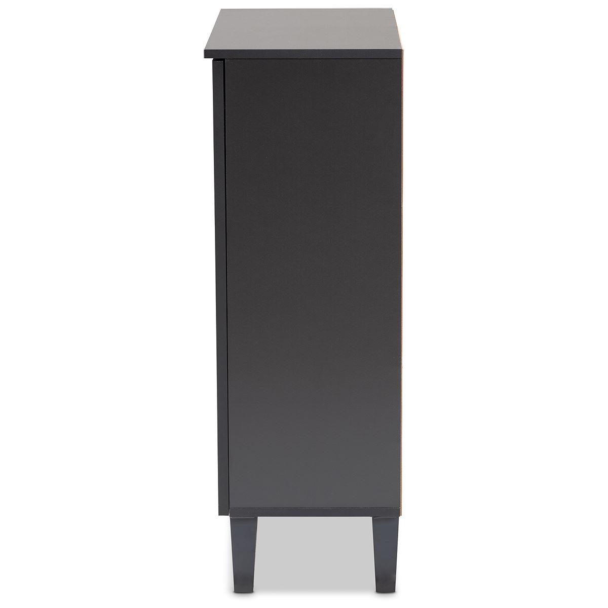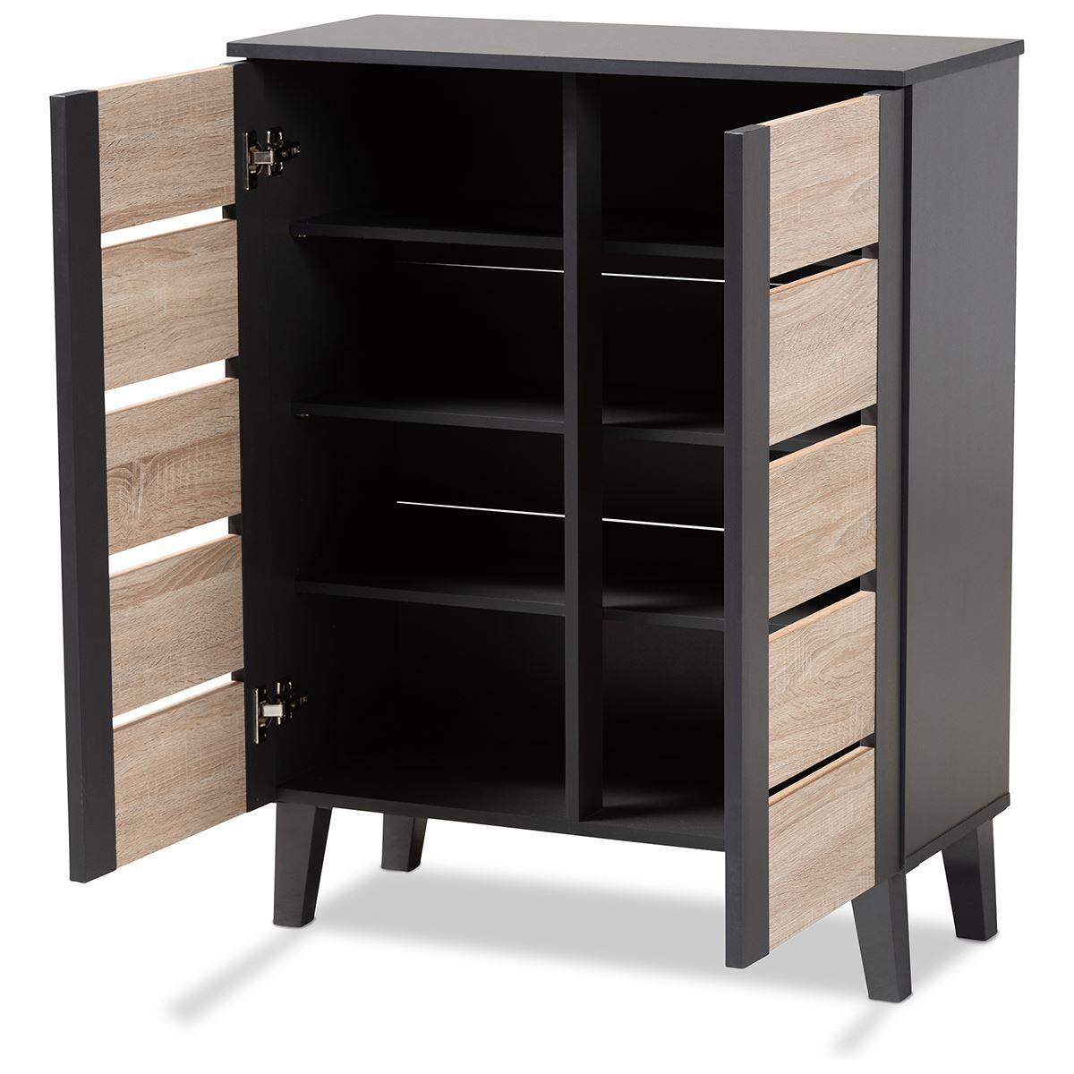 This Baxton Studio Melle 2 door wood entryway shoe storage cabinet makes organization easy. It features a clean, contemporary design, with engineered wood giving a chic two tone oak and dark grey finish. There are 2 doors that conceal 4 shelves with storage space for up to 8 pairs of shoes. Slits are embedded within the doors to enable air circulation and prevent mold growth on your shoes. Angled legs add a cool, mid-century modern touch. This item requires oversize delivery. Please refer to the Order Summary in the Shipping step at checkout for delivery charge.