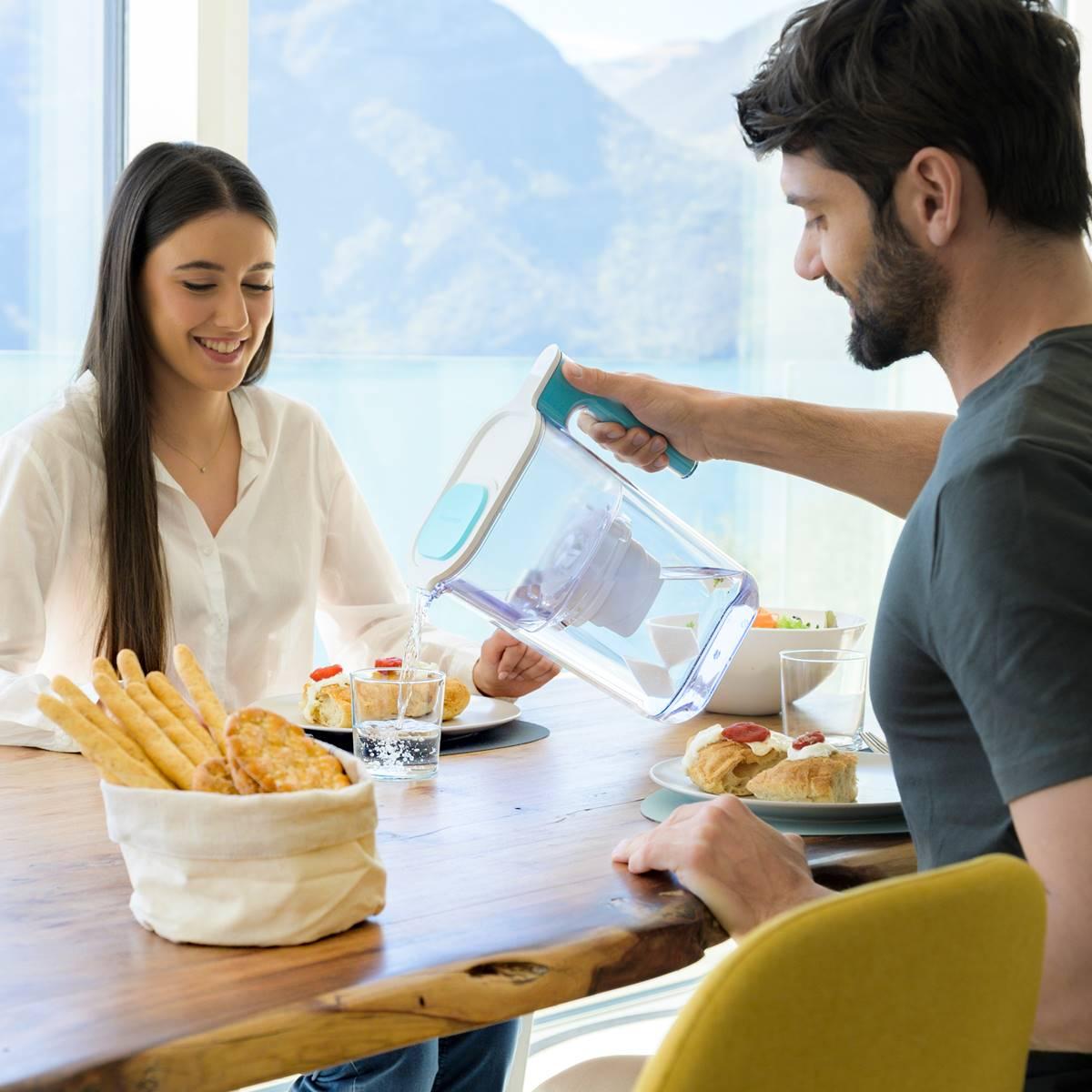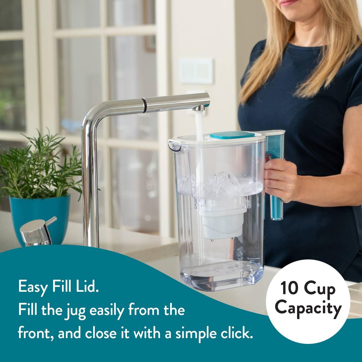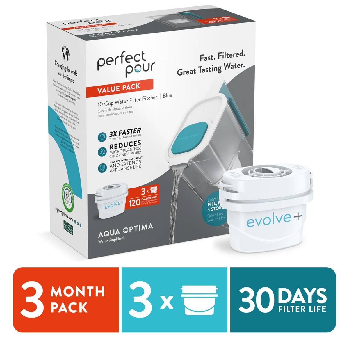 The Aqua Optima water filter pitcher with 3 Evolve+ water filters delivers great-tasting water, easily and quickly. Its unique design eliminates the splashes and spills caused by other brands and delivers a consistent laminar flow of water whether it's completely full, or ready for a refill. The ergonomic handle design and front-positioned slide-opening lid make it easier than ever to refill at the tap.