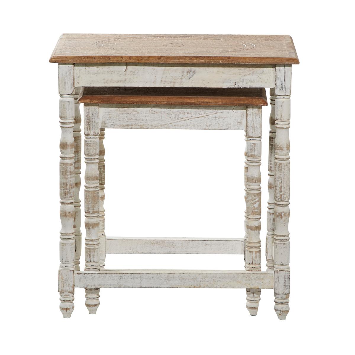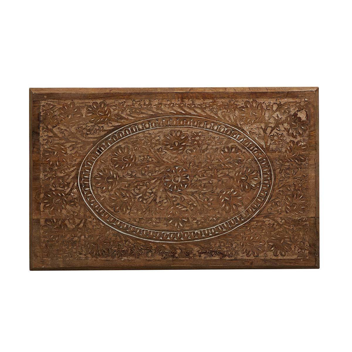 This 9th & Pike(R) duo of nesting wood accent tables are a must in your boho or eclectic style room. Rich mocha brown mango wood with whitewashing is carved into a large and smaller square table, each with ornately carved mandala and botanical circular designs on the top. The square table tops are perched on traditional-style turned column legs, the smaller of the two comfortably nesting within the larger table. Table Heights: 24", 20".