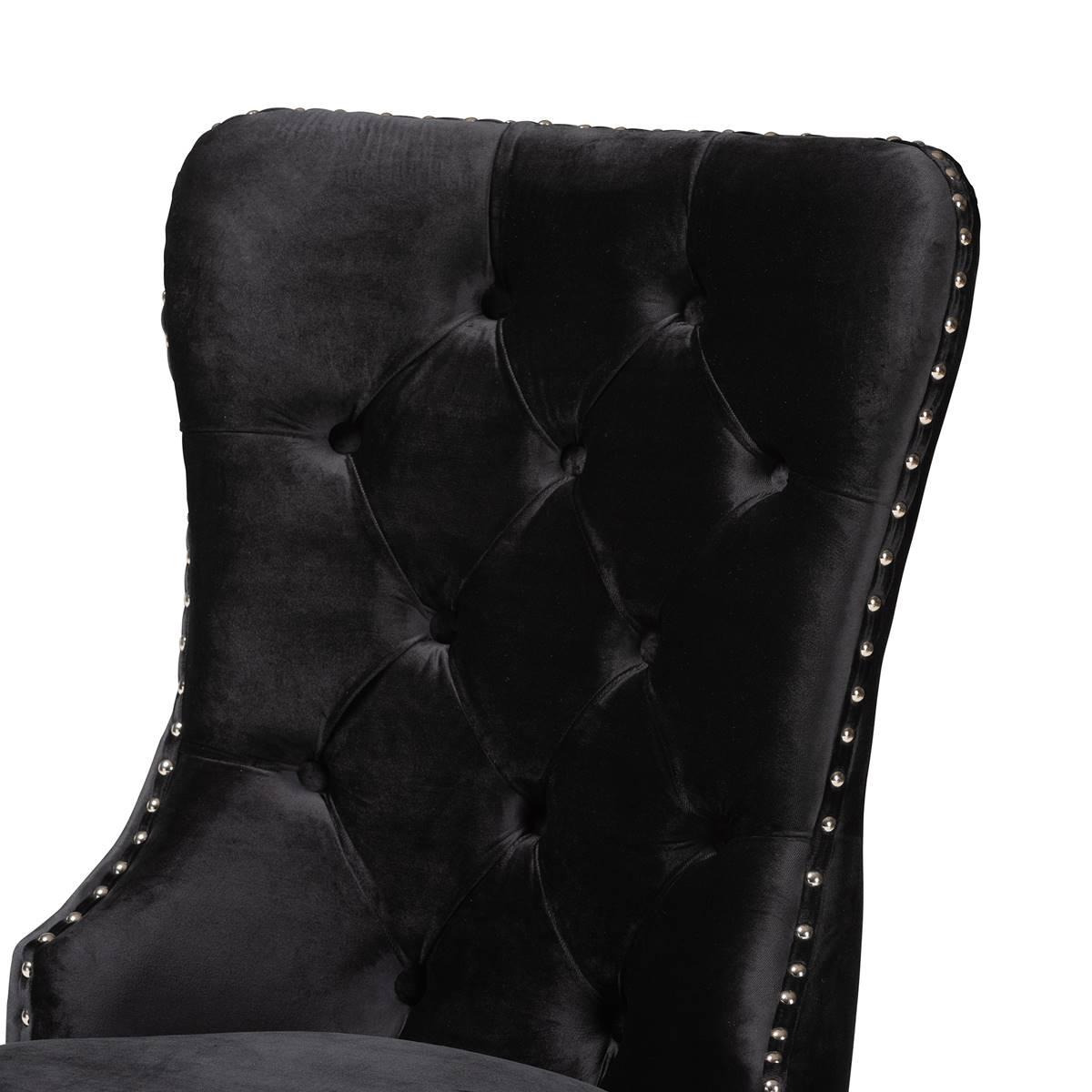 Saturate your space with the opulent charisma radiating from the remarkable Baxton Studio Honora dining chair. Made in China, this beautiful piece consists of a wood frame padded with foam and upholstered in sumptuous velvet fabric. The curves of the backrest are accentuated by a stunning nail head trim while a lovely button-tufted design expresses the luxurious nature of the piece. The Honora requires assembly and features tapered legs for excellent stability and support. Bringing a sense of indulgence to every occasion, the Honora dining chair is sure to leave an impression. This item requires oversize delivery. Please refer to the Order Summary in the Shipping step at checkout for delivery charge. Materials: Polyester, Oak + Eucalyptus Wood, Foam, Metal Limited Warranty.