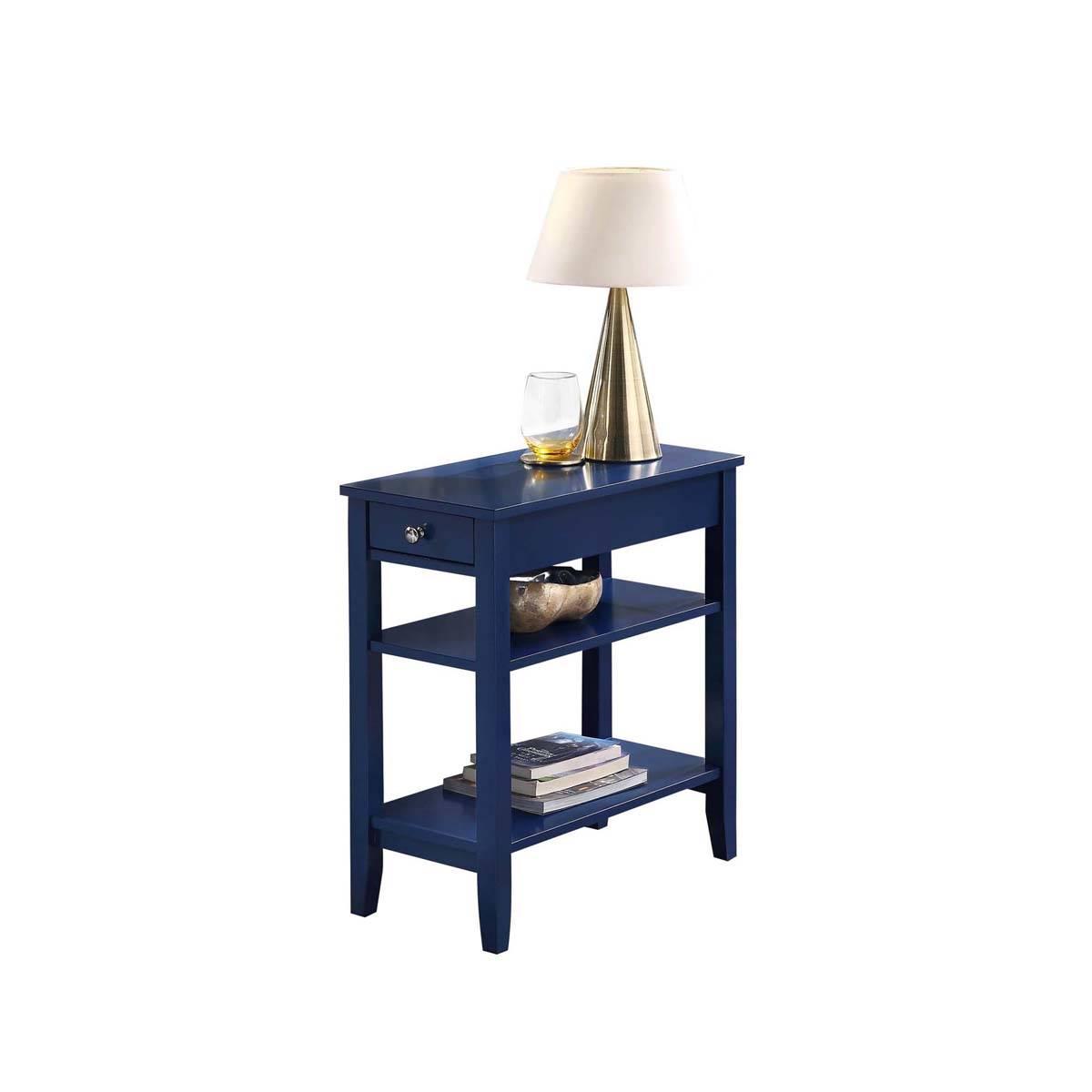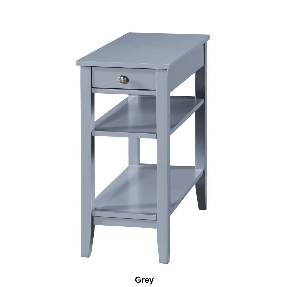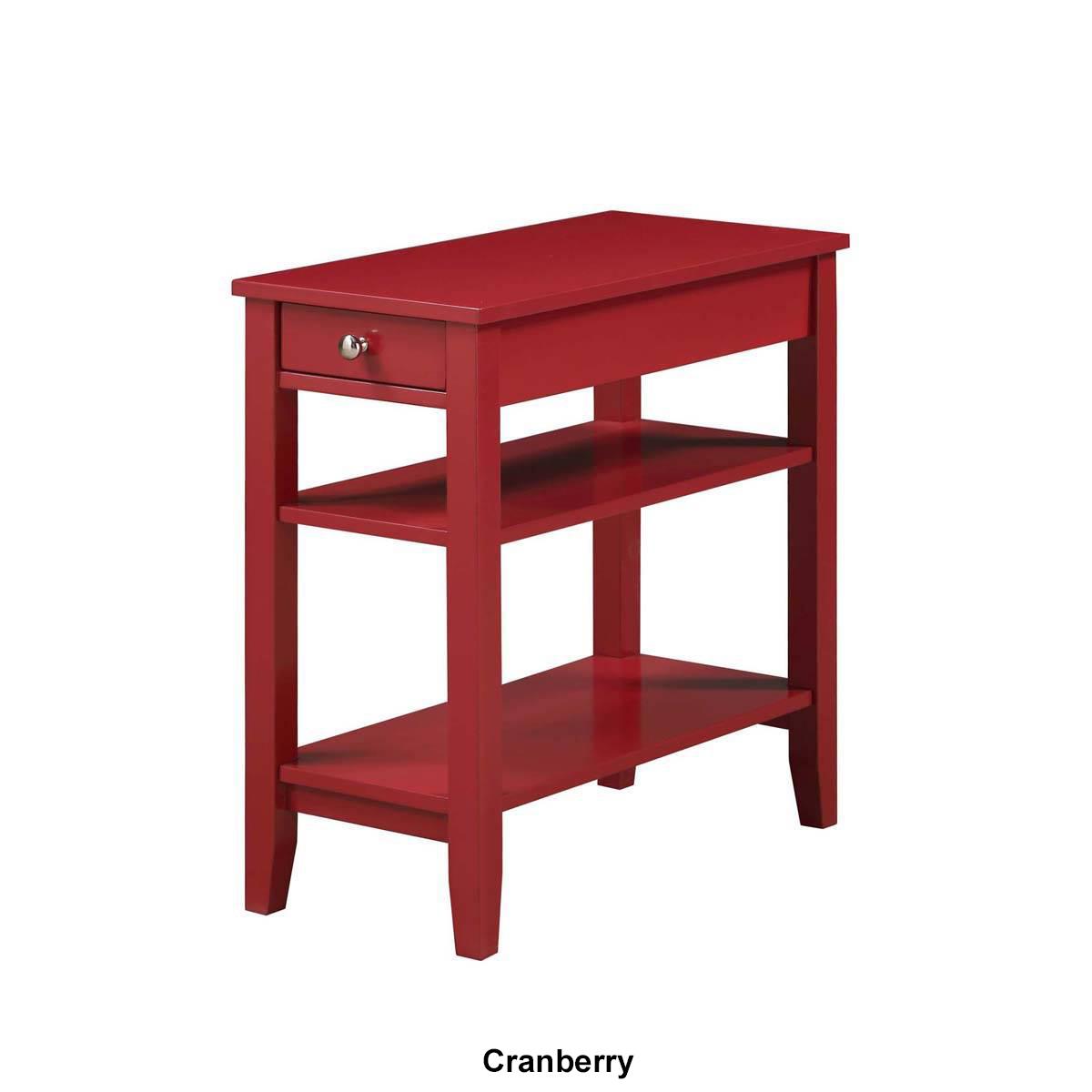 This Convenience Concepts American Heritage Drawer End Table is the perfect complement to any home. Featuring a drawer for hidden storage, you can hide away unsightly controls and accessories. Also featuring a middle and bottom shelf, you will have plenty of space to display collectibles or store magazines. This item requires oversize delivery. Please refer to the Order Summary in the Shipping step at checkout for delivery charge. Limited Manufacturer's Warranty. Material: MDF, Solid Rubberwood, Veneer.
