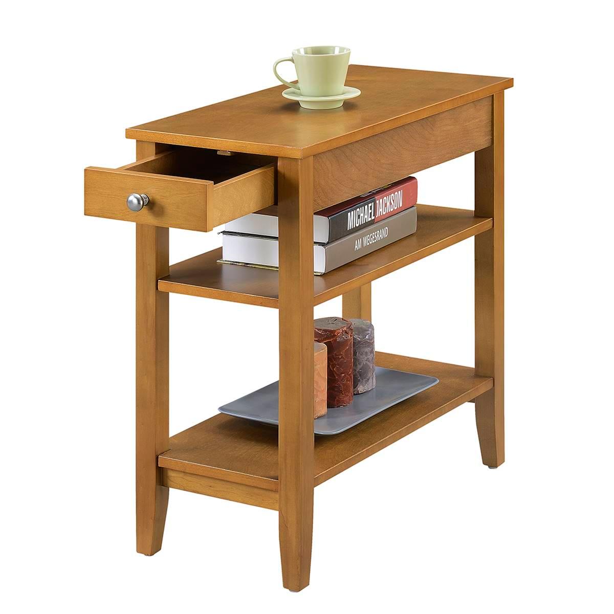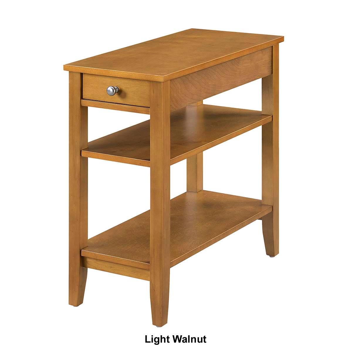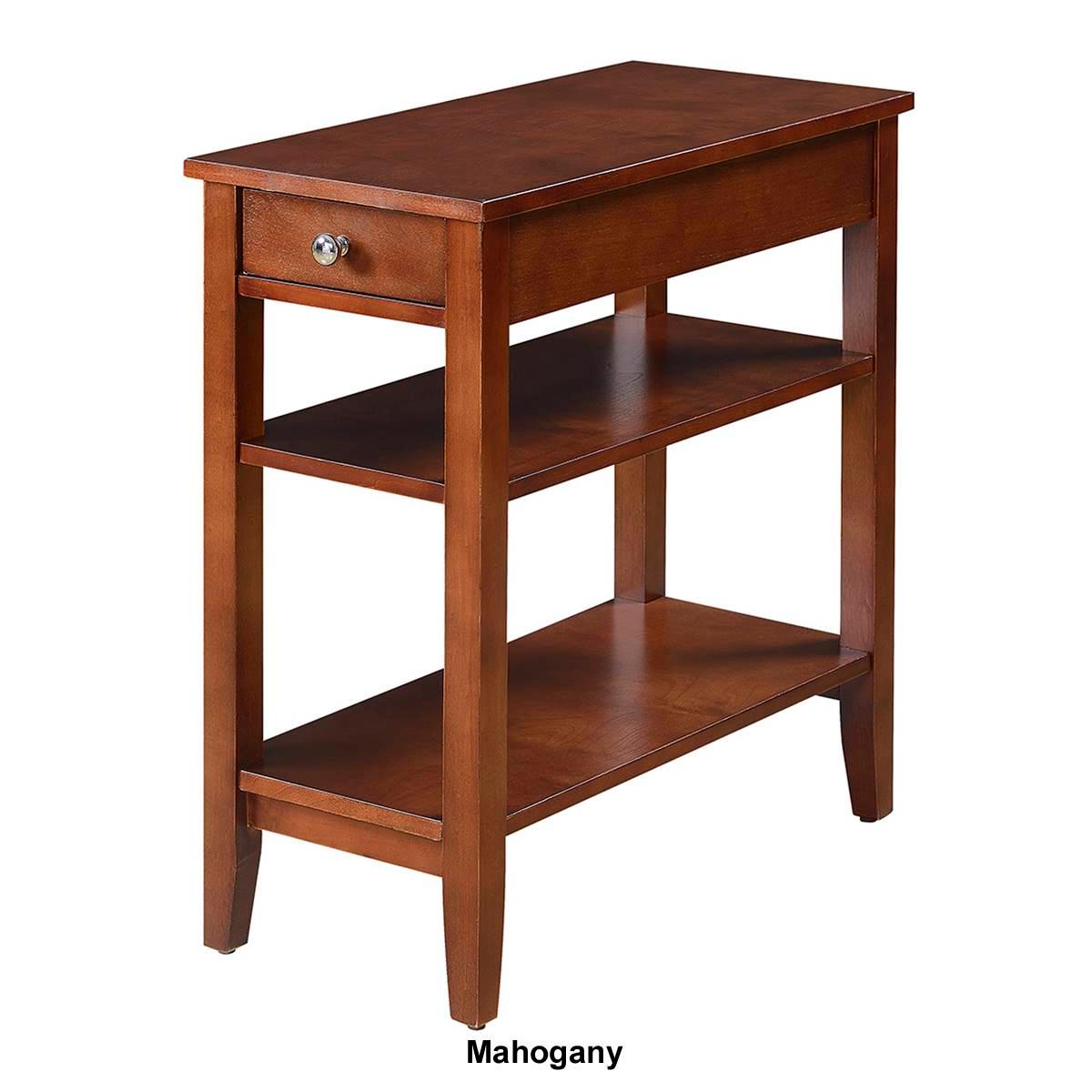 This Convenience Concepts American Heritage End Table with Shelves is the perfect complement to any home. Featuring a drawer for hidden storage, you can hide away unsightly controls and accessories. Also featuring a middle and bottom shelf, you will have plenty of space to display collectibles or store magazines. This item requires oversize delivery. Please refer to the Order Summary in the Shipping step at checkout for delivery charge. Limited Manufacturer's Warranty. Material: Particle Board, MDF.
