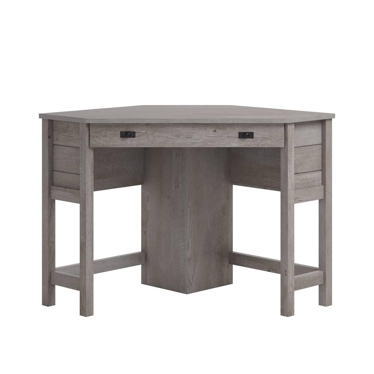 This Sauder Cottage Road corner computer desk allows for maximum conservation of floor space. Formed corner design saves space. The drawer/shelf features a flip-down panel for a laptop or keyboard/mouse. Material: Particle Board 5-Year Limited Warranty This item requires oversize delivery. Please refer to the Order Summary in the Shipping step at checkout for delivery charge.