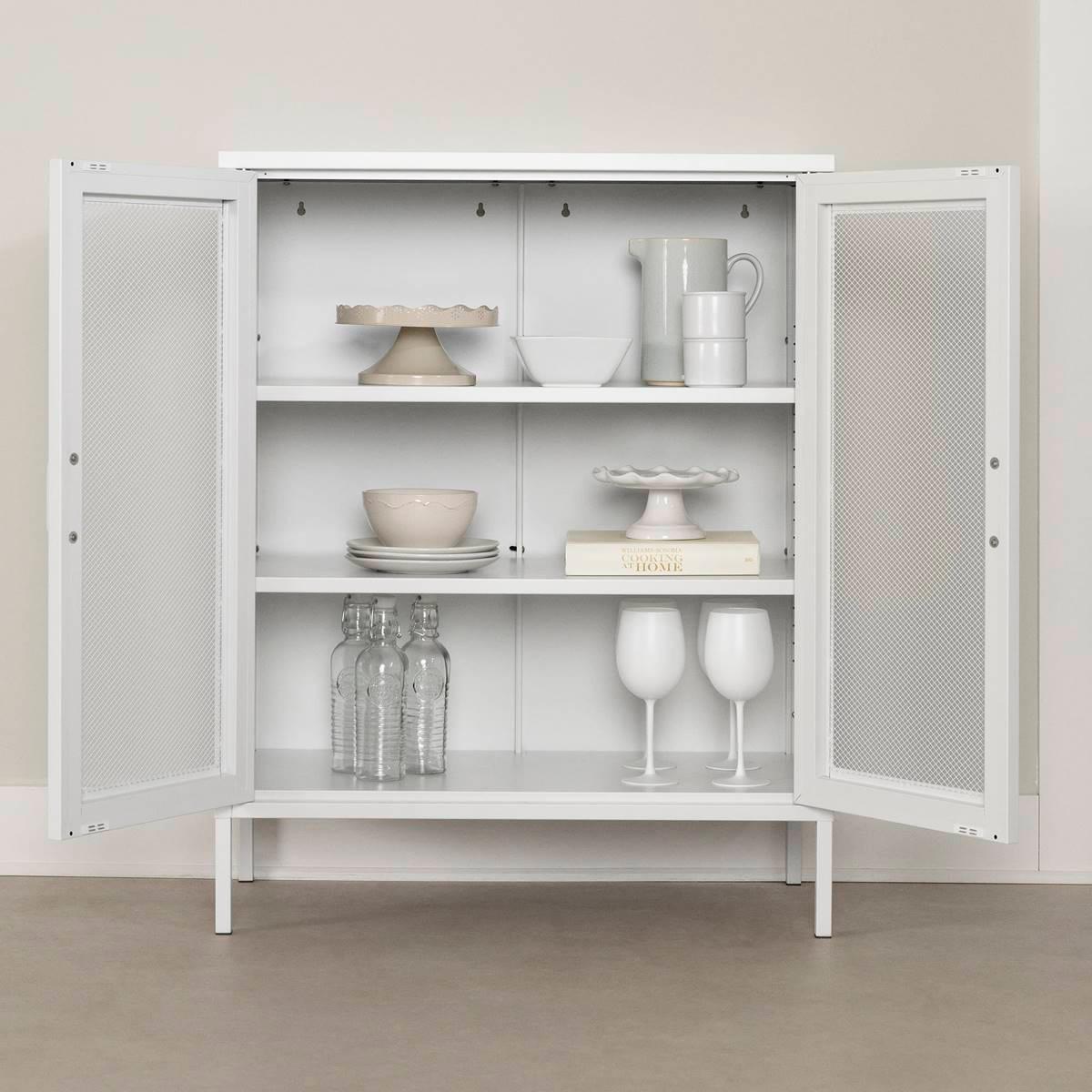 This minimalist contemporary-inspired south shore metal cabinet will give your dining room a sophisticated look. The straight lines, sleek handles, delicate legs, and mesh doors will add style to your decor. Fill it up with beautiful daily essentials such as wine glasses, napkins, and candles. This cabinet will not only declutter your kitchen, but it'll also add a trendy touch to whichever room you choose to put it in! This item requires oversize delivery. Please refer to the Order Summary in the Shipping step at checkout for delivery charge. Limited Warranty.