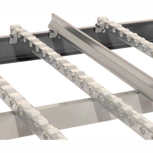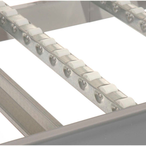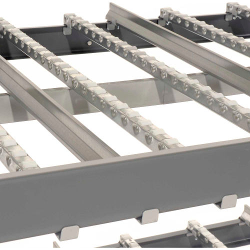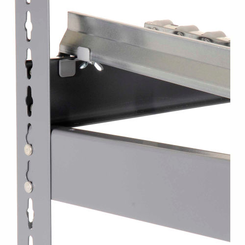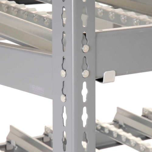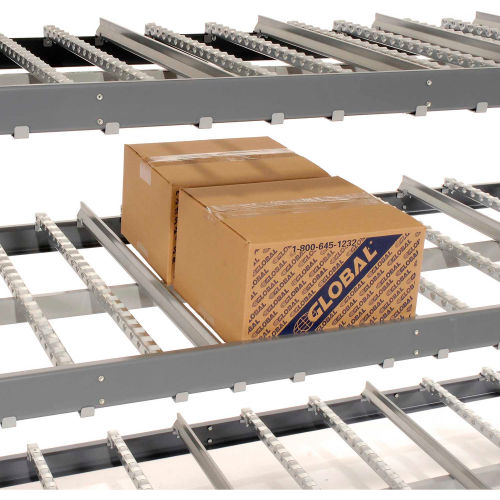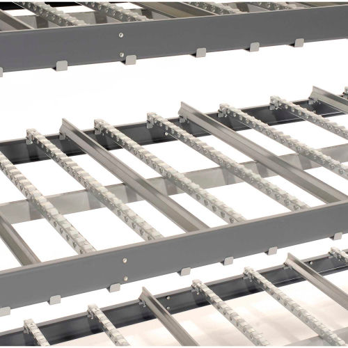 Double Depth Carton Flow Shelving 4 LEVEL 96"W x 72"D x 84"H Helps make inventory control more efficient. Unique "flow" design uses gravity to slide cartons to front for easy access. Loads from the back to ensure that first inventory in is the first inventory out. Cartons are transported on roller tracks constructed of U-shaped galvanized steel channels with plastic wheels that support 50 lbs./ft. Box guide rails can be adjusted horizontally and beams can be adjusted vertically to accommodate varying carton sizes. Storage shelf levels are adjustable on 1.5" centers for height flexibility. Box guide rails are used between each pair of roller tracks. Additional roller tracks can be added depending upon carton sizes. Each gravity flow storage level includes four pair of roller tracks with five box guide rails and one cross support. Racks include 5/8" thick particle board top storage level that supports up to 1000 lbs. DOUBLE-DEPTH UNITS are two single units bolted front-to-back offering greater carton capacity. Gray baked enamel finish. Easy assembly.