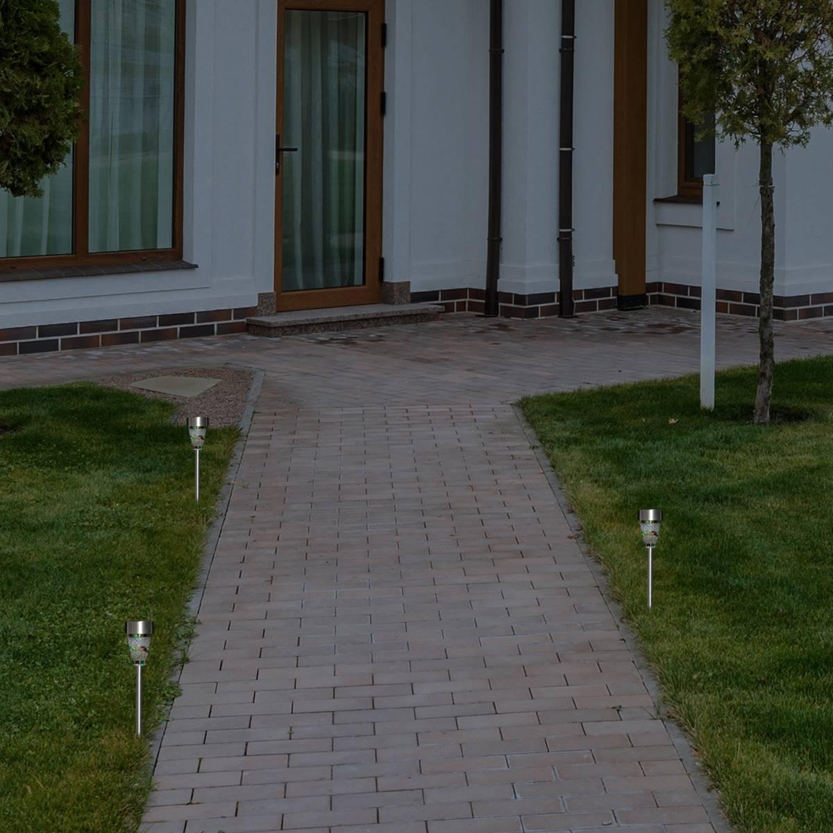 Designed to illuminate your pathways driveway or garden, these Northlight Seasonal Mosaic Stained LED pathway markers provide bright energy efficient light that will last all night long. Made with weather-resistant materials each marker has a solar panel that absorbs the sun during the day and automatically turns on at dusk. These solar lights emit a bright white light that is both attractive and functional. The solar-powered feature makes installing these markers easy allowing you to use them in any place that gets direct sunlight. Upgrade your outdoor lighting today! Markers contain (1) 1.2V AA100mAh NI-MH rechargeable battery 6-8 hours of Working time Ground stakes are included.