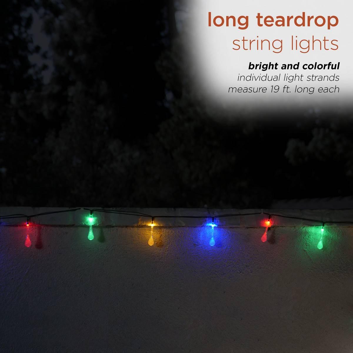 Decorate your porch, patio, or deck with the Alpine Corporation 20-piece set of two solar-powered multi-color dual-function teardrop string lights. Each strand is 19 feet long and can easily be installed in any outdoor area to add colorful light wherever you need it. With 20 multi-color LED lights, this set of string lights produces a vibrant display and includes both steady and flash modes for a customizable ambiance. The solar-powered design of these lights allows you to add colorful light to almost any space without the need to track down batteries or charging cords. With a durable design, these string lights are built for long-lasting use. Total Length: 19ft. Limited Warranty This item requires oversize delivery. Please refer to the Order Summary in the Shipping step at checkout for delivery charge.