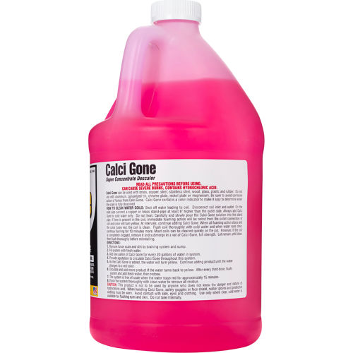 Calci Gone is a super concentrated industrial strength acid based descaler. Calci Gone is color coded so the technician can see by the change of the water color when the scale is gone. It is super concentrated for tough jobs where heavy deposits of scale, lime or mineral deposits are present. Descales cooling towers, boilers, hot water coils, urinals and toilet bowls Dissolves lime, scale, mineral deposits and urine salts Color coded formula to know when scale is gone Cleans rust stains and concrete Can be used on brass, cooper, steel, stainless steel, wood, glass, plastic and rubber Contains corrosion inhibitor.