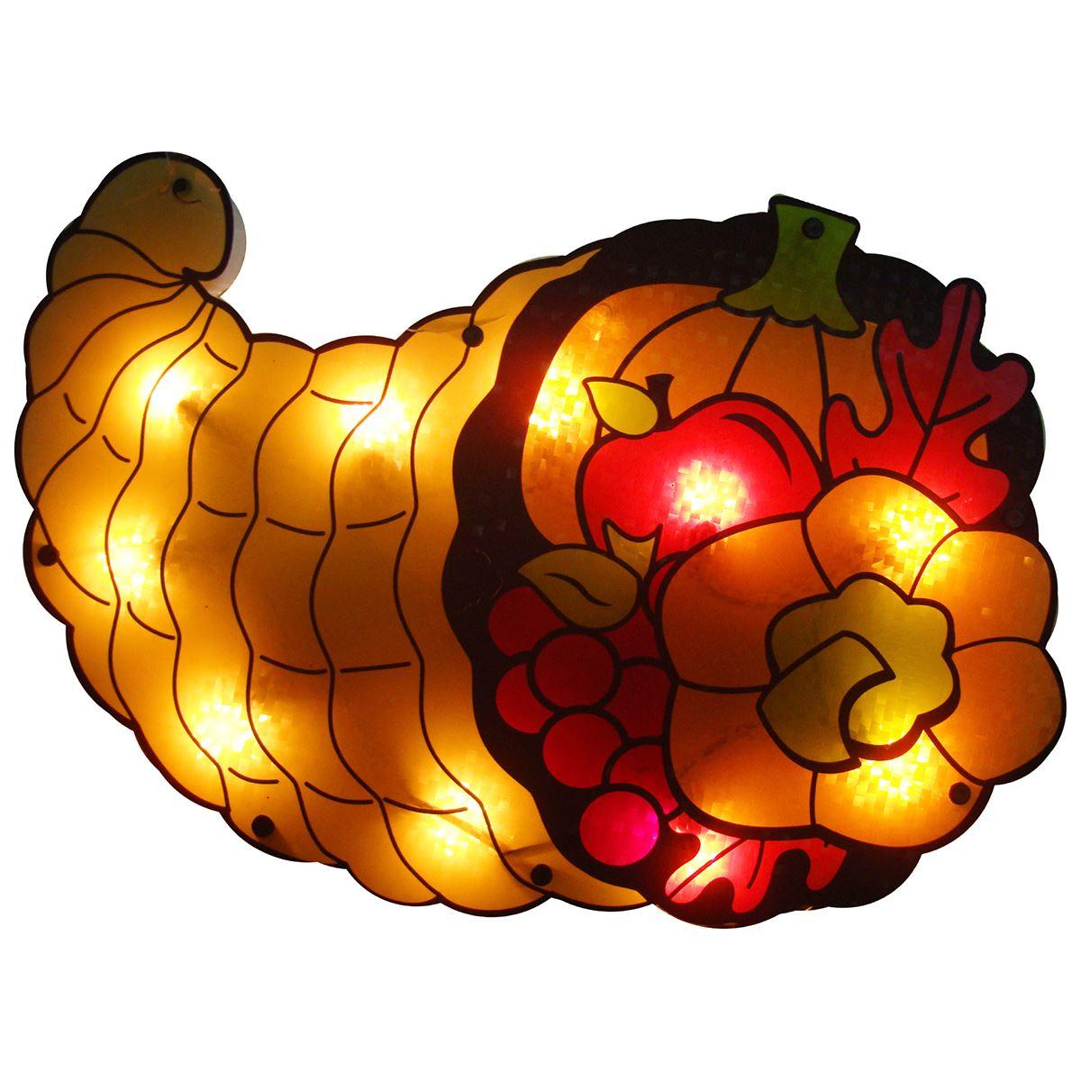 This Northlight Seasonal inch pre-lit cornucopia Thanksgiving window silhouette decoration features a cornucopia filled with the bounty of fall. There are 10UL listed super bright bulbs that have a double sided design and if one bulb burns out the rest will stay lit. It comes with replacement bulbs and spare fuses and contains 1 plug with end connector which allows you to stack multiple lighted items together (not to exceed 210 watts). Bulb size: mini. 24 inch white lead cord Indoor/Outdoor Suction cup included 120 volts 60 hertz .12 amps 14.4 watts Materials: Metal, Wire and Glass bulbs.