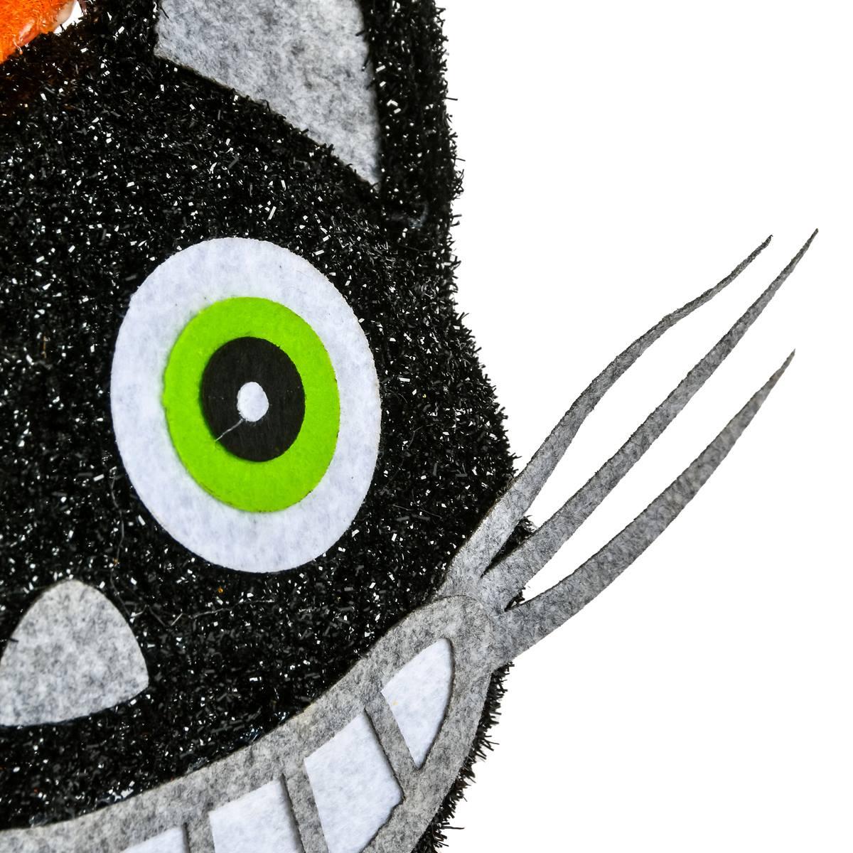 This National Tree 23-inch Pre-Lit Pumpkin and Black Cat decor features a scary face jack-o-lantern with a silly grinning yellow-eyed black cat popping up from inside. It is constructed of a glittering tinseled fabric that is wrapped around a sturdy wire frame and lit from inside with 40 battery-operated warm white LED lights. This fun and unique decoration can be displayed in indoor or covered outdoor locations. Material: Metal, Polyester, Plastic, Non-Woven Fabrics.