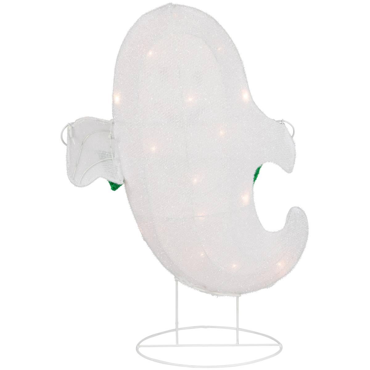 Easy to set up and weather-resistant this Norhtlight Seasonal ghostly decoration is sure to add a fun and festive touch to your Halloween festivities. This eye-catching yard decoration features a friendly ghost with a playful "Boo" banner perfect for welcoming trick-or-treaters to your home. The decoration is illuminated with bright energy-efficient LED lights ensuring that it will stand out in the dark of night. Product Features: Lighted ghost Halloween decoration. Holding a green and orange banner that reads "BOO". Pre-lit with 15 clear lights. Bulb size: mini. Bulb type: LED. LED lights use 90% less energy. Bulbs stay cool to the touch. 52"lead cord. UL certified and approved for indoor or outdoor use. Additional Product Features: 3-dimensional decoration. Lighted with LED lights which make it visible even in low light conditions. Contains 1 end connector which allows you to stack multiple lighted items together (not to exceed 210 watts). Some quick and easy assembly required. Includes a metal stand and clear zip ties. UL certified and approved for indoor or outdoor use. 120 volts 60 hertz 0.08 amps 9.6 watts Dimensions: 25"H x 18"W x 7.5"D. Material(s): chenille/wire/glass bulbs/plastic/metal.