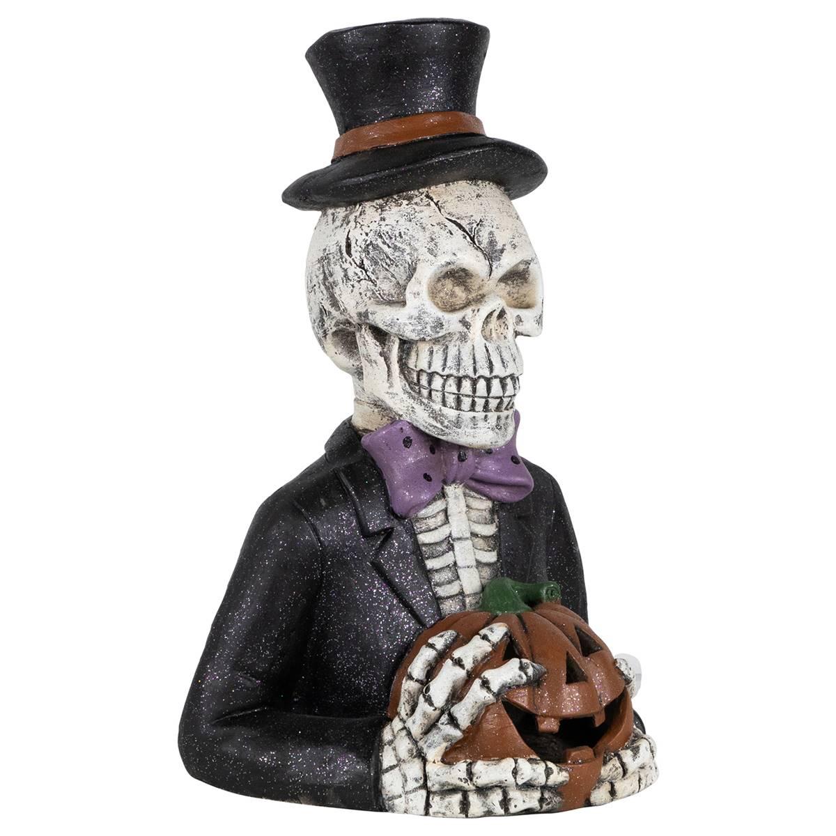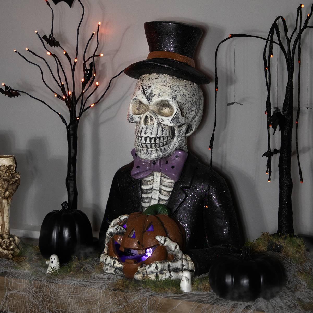 Get ready to spookify your Halloween decor with this Northlight Seasonal LED skeleton and jack-o-lantern Halloween decor. This eerie yet enchanting skeleton is dressed to impress donning a stylish black jacket a dapper top hat and a vibrant purple bow tie. With pre-lit LED lights it casts a hauntingly beautiful glow. Embellished with sparkling glitter accents this skeletal figure confidently holds a jack-o-lantern adding festive charm to any Halloween display. Get your guests into the spirit of the season with this bewitching addition to your home or party atmosphere. Pre-lit with LED lights Batteries required Comes with on/off switch For indoor use only Material(s): ceramic.